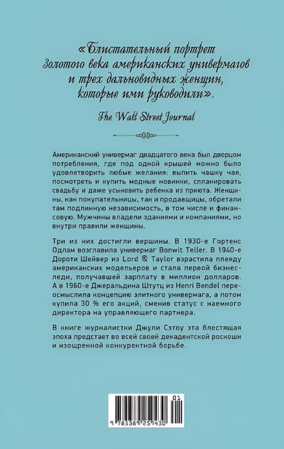 Известная американская журналистка реконструирует жизненный и карьерный путь женщин, которые руководили крупными универмагами Нью-Йорка в 1920-е — 1960-е годы и превратили их в рай для покупательниц всех возрастов и социальных слоев. Благодаря этим женщинам американская модная индустрия обрела собственное лицо и перестала слепо копировать европейскую, прежде всего парижскую моду. Каждая из героинь книги — сильная и яркая личность, чей пример помог миллионам женщин поверить в себя и сменить домашнее хозяйство на профессиональную карьеру.