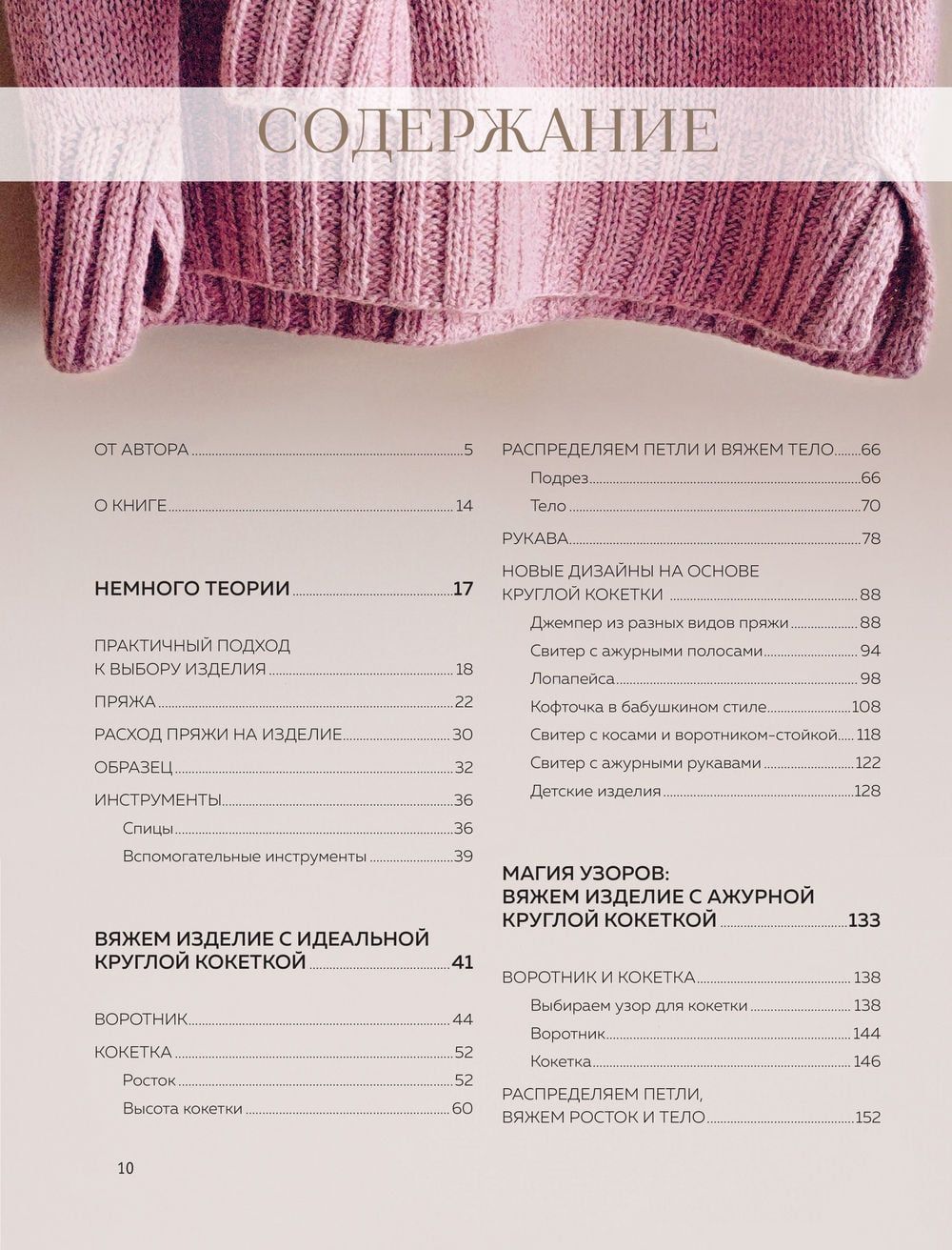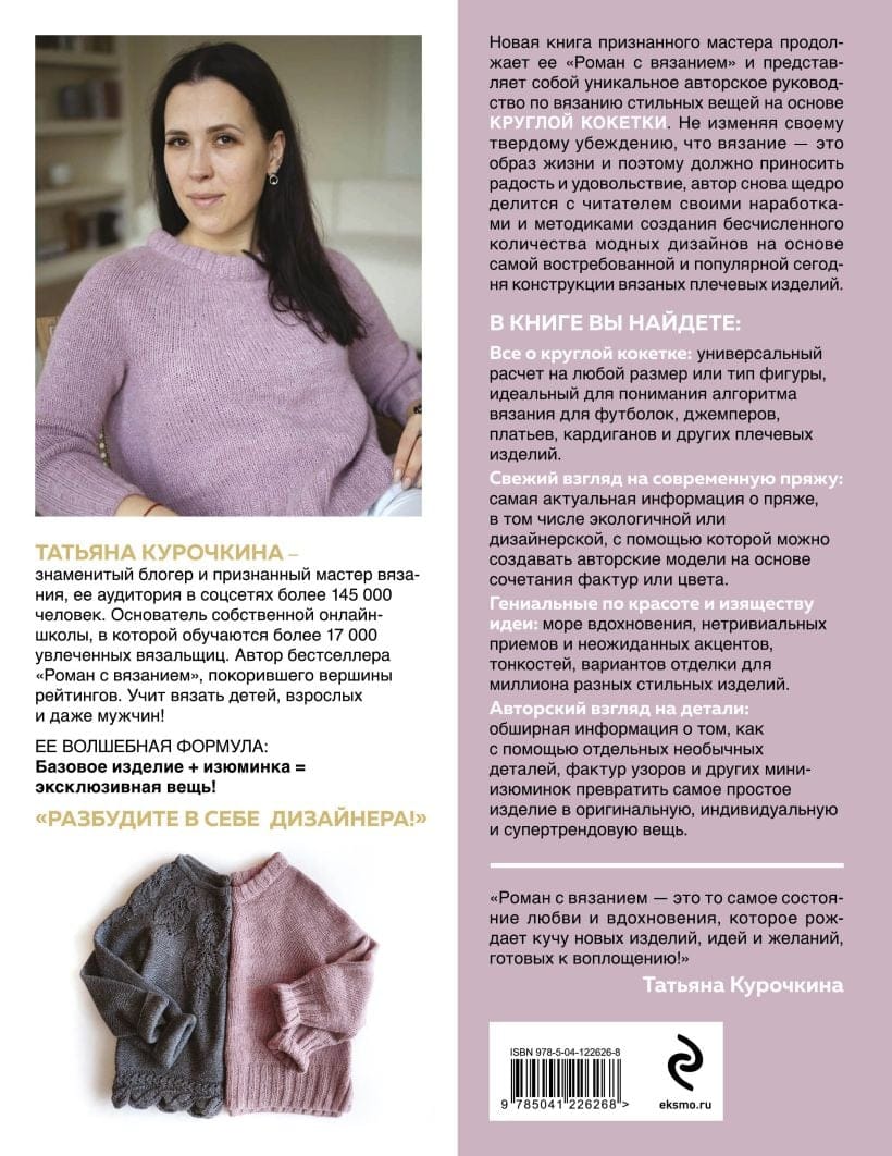 Волшебная формула автора этой удивительной книги: «Базовое изделие на основе КРУГЛОЙ КОКЕТКИ + авторская изюминка = эксклюзивная, неповторимая вещь!» Самая популярная конструкция плечевых изделий предстанет во всех своих ипостасях! В книге вы найдете уникальный материал, который сделает из вас не просто вязальщицу, а настоящего дизайнера: - Все о круглой кокетке: универсальный расчет на любой размер или тип фигуры, идеальный для понимания алгоритм вязания для футболок, джемперов, платьев, кардиганов и других плечевых изделий. - Свежий взгляд на современную пряжу: самая актуальная информация о пряже, в том числе экологичной или дизайнерской, с помощью которой можно создавать авторские модели на основе сочетания фактур или цвета. - Гениальные по красоте и изяществу идеи: море вдохновения, нетривиальных приемов и неожиданных акцентов, тонкостей, вариантов отделки для миллиона разных стильных изделий. - Авторский взгляд на детали: вдохновляющая информация о том, как с помощью отдельных необычных деталей, фактур узоров и других мини-изюминок превратить самое простое изделие в оригинальную, индивидуальную и супертрендовую вещь. Минимум расчетов, теоретических выкладок и рассуждений, максимум практической пользы и вдохновения! А еще уникальная харизма и чувство юмора автора, благодаря которым вязание становится легким и приносит море удовольствия!