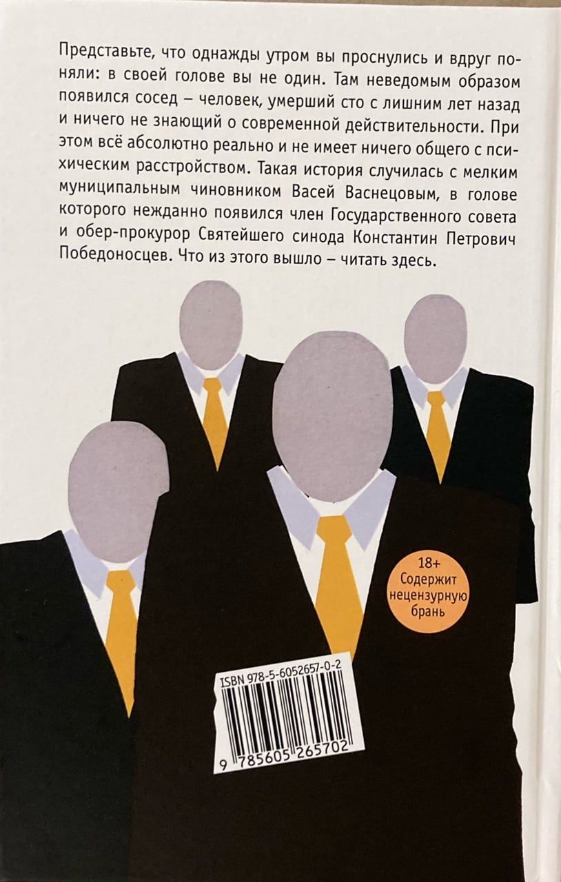 Представьте, что однажды утром вы проснулись и вдруг поняли: в своей голове вы не один. Там неведомым образом появился сосед – человек, умерший сто с лишним лет назад и ничего не знающий о современной действительности. При этом всё абсолютно реально и не имеет ничего общего с психическим расстройством. Такая история случилась с мелким муниципальным чиновником Васей Васнецовым, в голове которого нежданно появился член Государственного совета и обер-прокурор Святейшего синода Константин Петрович Победоносцев.