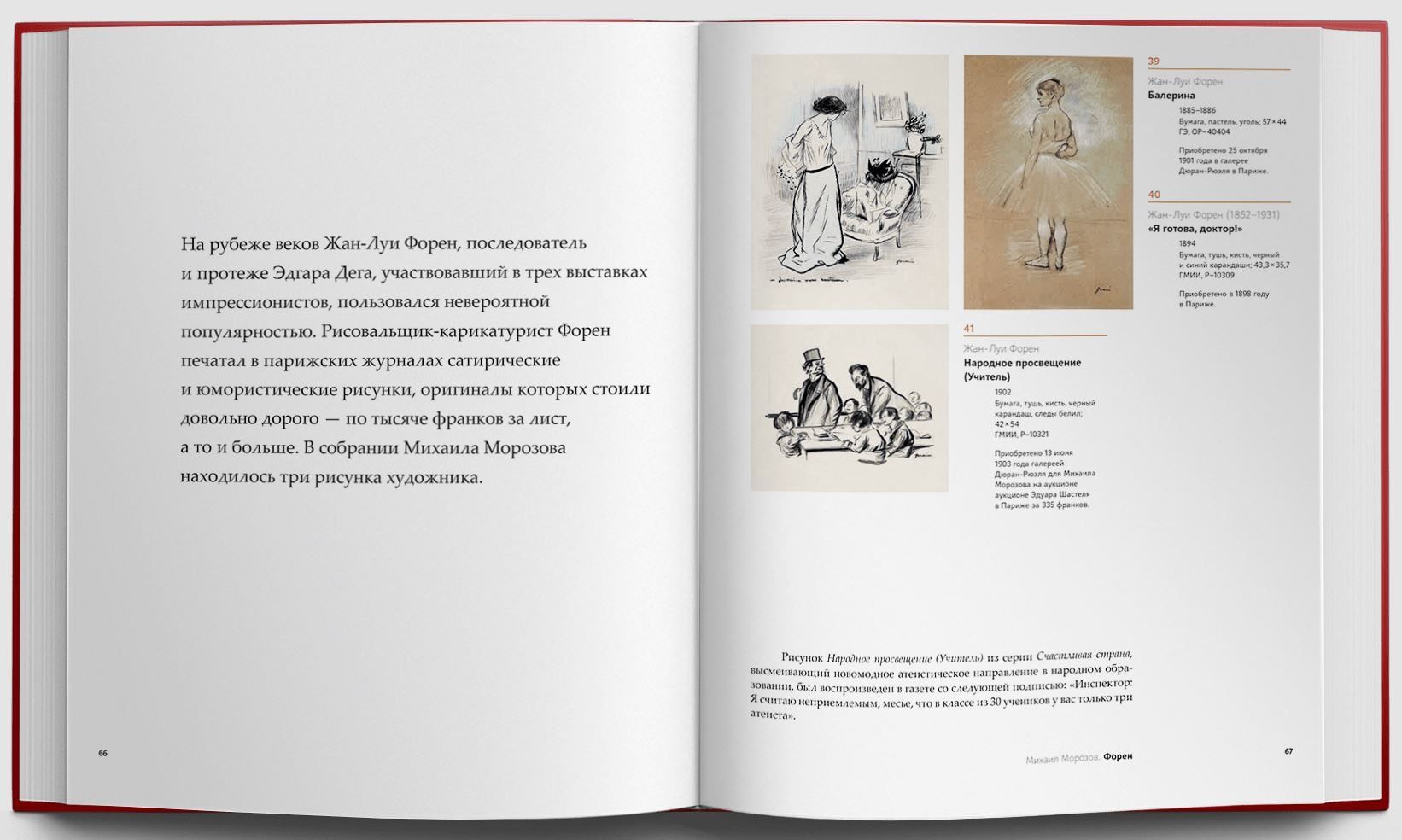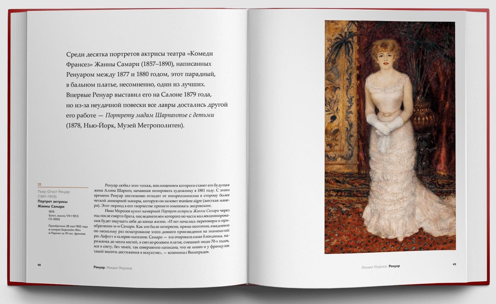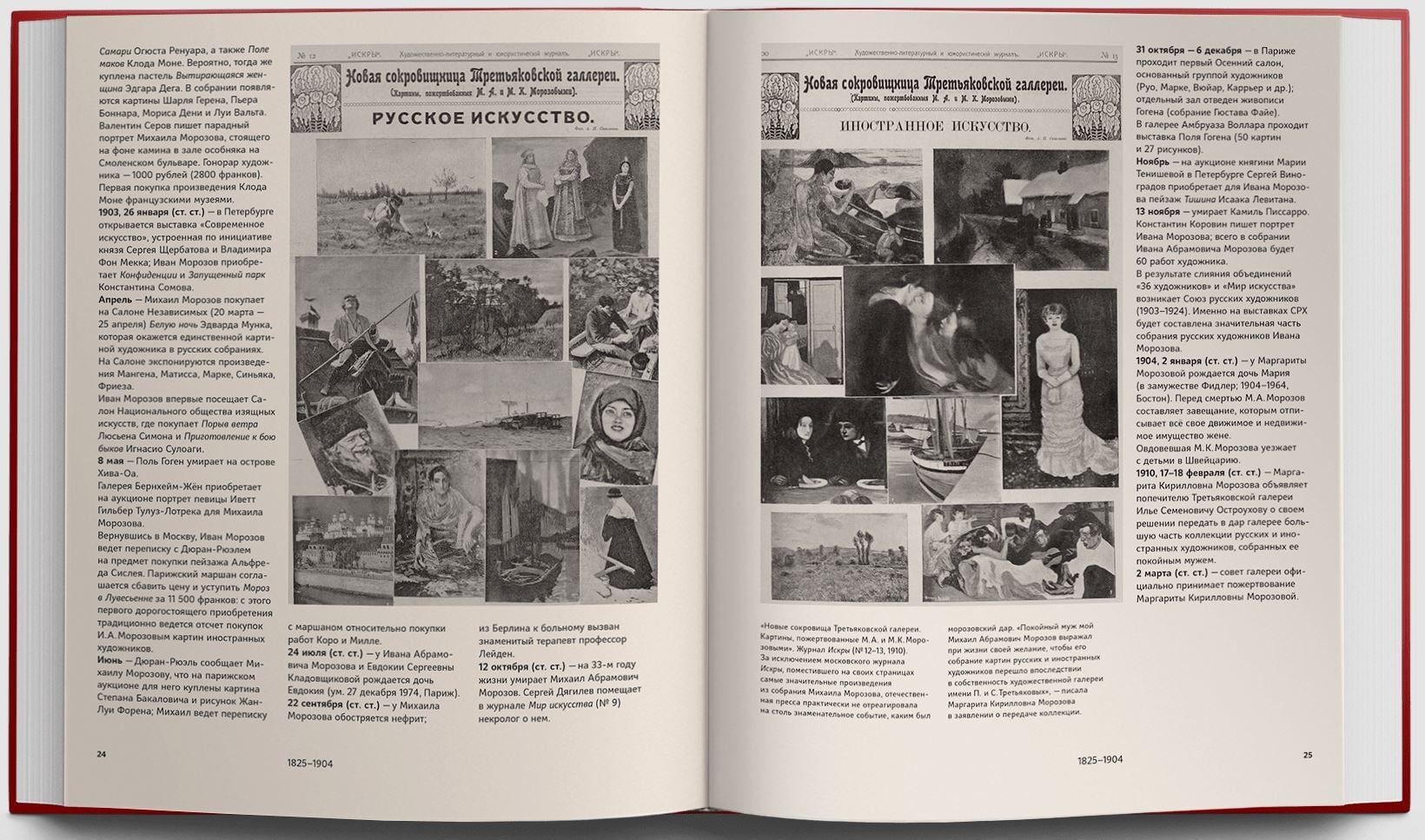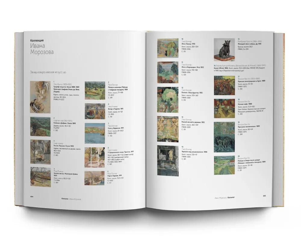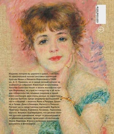 Мало кто знает, что наряду с богатейшим собранием произведений французских живописцев и скульпторов коллекции братьев Морозовых включали работы современных им русских художников. Впервые русские и иностранные части каждого из собраний представлены вместе, что позволяет читателям познакомиться с уникальными коллекциями московских текстильных магнатов начала ХХ столетия. Среди шедевров французской части собраний — полотна Моне и Ренуара, Сезанна и Гогена, Дени и Боннара, Матисса и Пикассо. Русские части представлены картинами Врубеля, Левитана, Серова, Коровина, Головина, Ларионова, Шагала. Впервые подтверждено, что десятки полотен русских художников, когда-то разошедшиеся по различным музеям, происходят из коллекции Ивана Морозова. В каталог коллекции Морозовых включены архивные документы и фотографии.