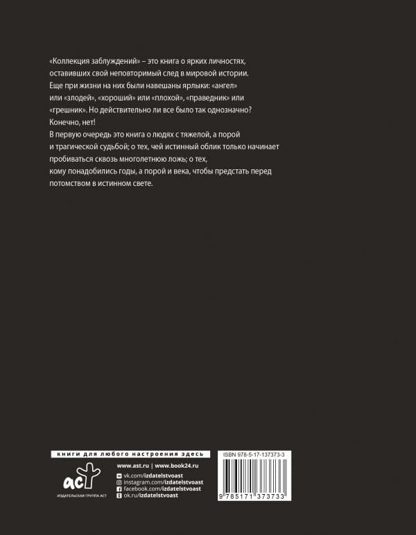 «Коллекция заблуждений» – это книга о ярких личностях, оставивших свой неповторимый след в мировой истории. Ещё при жизни на них были навешены ярлыки: «ангел» или «злодей», «хороший» или «плохой», «праведник» или «грешник». Но действительно ли всё было так однозначно? Конечно, нет! В первую очередь, это книга о людях с тяжёлой, а порой и трагической судьбой; о тех, чей истинный облик только начинает пробиваться сквозь многолетнюю ложь; о тех, кому понадобились годы, а порой и века, чтобы предстать перед потомством в истинном свете.