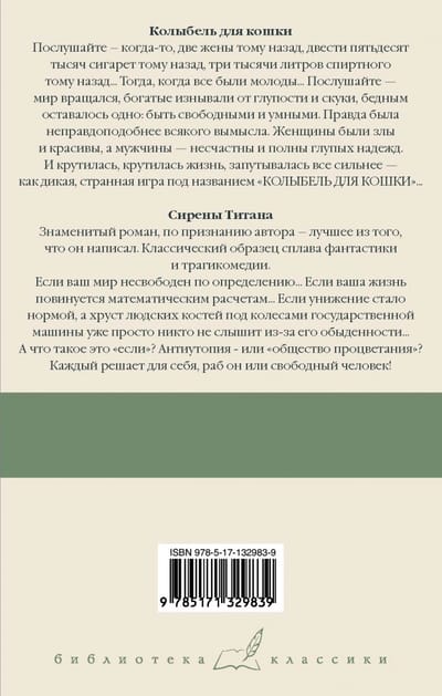 «Колыбель для кошки». Послушайте — когда-то, две жены тому назад, двести пятьдесят тысяч сигарет тому назад, три тысячи литров спиртного тому назад... Тогда, когда все были молоды... Послушайте — мир вращался, богатые изнывали от глупости и скуки, бедным оставалось одно — быть свободными и умными. Правда была неправдоподобнее всякого вымысла. Женщины были злы и красивы, а мужчины — несчастны и полны глупых надежд. И крутилась, крутилась жизнь, запутывалась все сильнее — как дикая, странная игра под названием «КОЛЫБЕЛЬ ДЛЯ КОШКИ»... «Сирены Титана». Если ваш мир несвободен по определению... Если ваша жизнь повинуется математическим расчетам... Если унижение стало нормой, а хруст людских костей под колесами государственной машины уже просто никто не слышит из-за его обыденности... А что такое это «если»? Антиутопия — или «общество процветания»? Каждый решает для себя сам, раб он — или свободный человек!