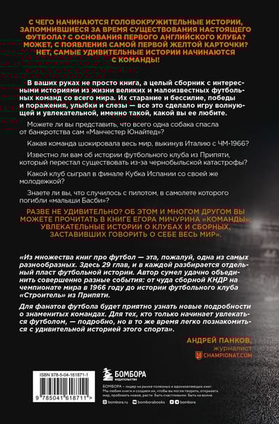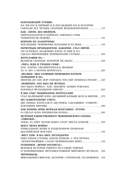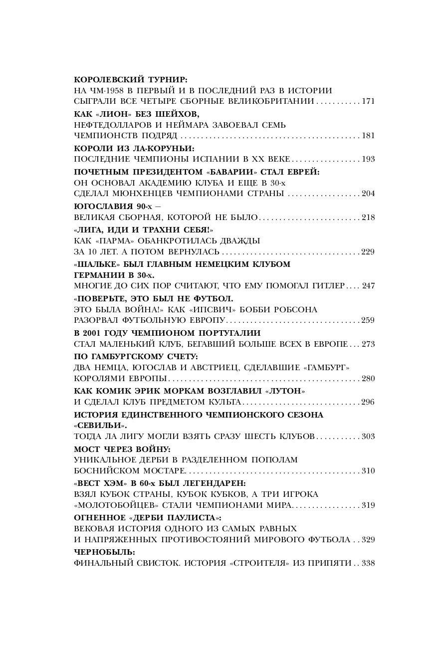 Это не просто книга, а целый сборник с интересными историями из жизни великих футбольных команд со всего мира. Их старание и бессилие, победы и поражения, улыбки и слёзы, всё это сделало игру волнующей и увлекательной, именно такой, какой вы её любите. Какая сборная стала величайшей в истории европейского футбола? Можете ли вы представить, что всего одна собака спасла от банкротства сам «Манчестер Юнайтед»? Проиграв какой команде в 1996-м году Италия вылетела из Чемпионата мира? О чем расскажет история футбольного клуба из Припяти, который перестал существовать из-за Чернобыльской катастрофы? Как хорваты и босняки сыграли между собой в одном из самых горячих дерби мира в Мостаре? Что за клуб, будучи самым маленьким в Европе, дошел до полуфинала Кубка Интертото? Знаете ли вы об истории пилота, в самолёте которого погибли «малыши Басби»? Ну, и наконец, вы когда-нибудь слышали о тренере, поработавшем за свою карьеру с полусотней команд на пяти континентах, счастливо избежавшем геноцида, смерти за связь со шпионкой и учившем играть в футбол каннибалов?