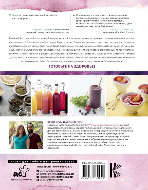 Комбуча. Это приятный газированный напиток, который благотворно влияет на организм, повышая иммунитет, улучшая пищеварение. Эксперты по комбуче Ханна Крум и Алекс Лагори рассказывают, как легко, недорого и безопасно приготовить вкусный чайный гриб у себя дома. Знаете ли вы, что комбучу можно использовать как маску или крем для лица? Помимо альтернативного использования, в книге вы найдете понятные и подробные инструкции по приготовлению комбучи, а также необычные рецепты алкогольных и безалкогольных коктейлей, смузи, закусок, сладостей и многое другое. Книга сопровождается необычными фактами о чайном грибе, интересными историческими справками и научными исследованиями. Книга обязательна к прочтению как новичкам, так и давним любителям комбучи.