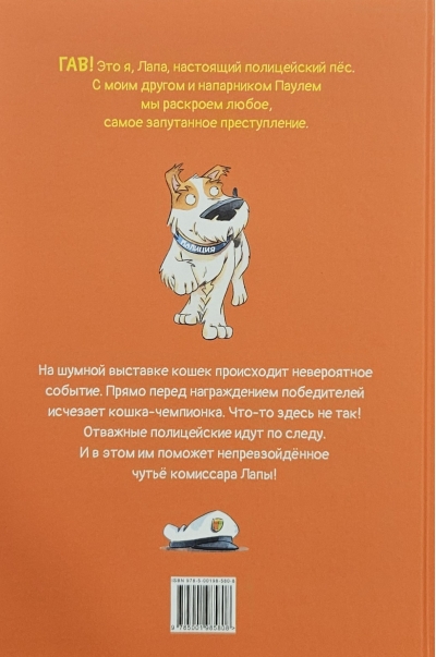 Познакомьтесь с самым очаровательным, весёлым и умным полицейским псом на свете! Комиссар Лапа и его напарник Пауль получают срочный вызов. Породистая кошка-чемпионка пропала из своей переноски прямо во время выставки кошек. Комиссар Лапа немедленно берется за дело. А это значит, что он обязательно вернёт хозяйке её любимицу! Катя Райдер автор более ста пятидесяти детских и юношеских книг, которые переведены на многие языки мира. Она очень любит собак. У неё дома живёт пёс Польди, который тоже мечтает стать настоящим полицейским. Дирк Хенниг известный иллюстратор. У него тоже есть четвероногий друг по кличке Пико. Именно он вдохновил художника на создание образа комиссара Лапы.
