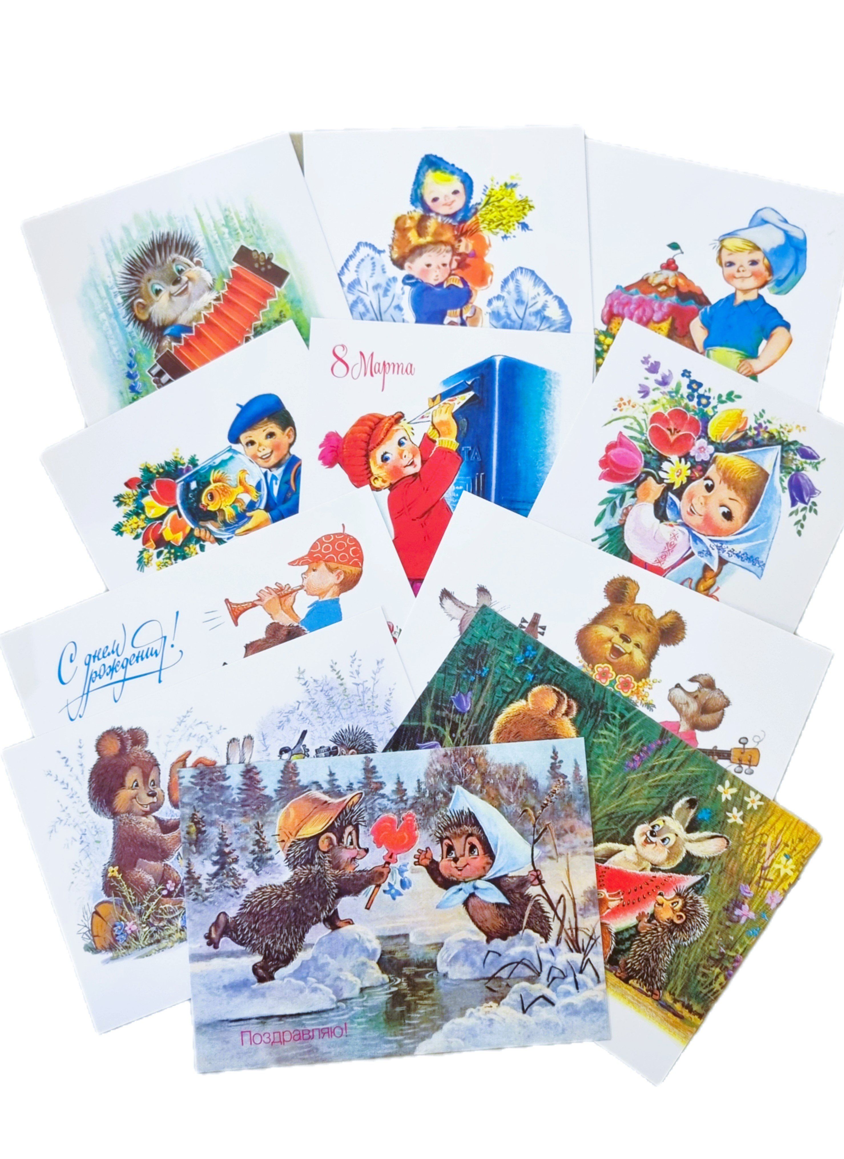 Набор поздравительных ретро открыток с рисунками Владимира Зарубина. В наборе 12 открыток с разными сюжетами. Открытки прямоугольные. Размеры открыток: 14.5 см Х 10.5 см Добрые зверушки и дети так радуются весне, что хочется немедленно к ним присоединиться.