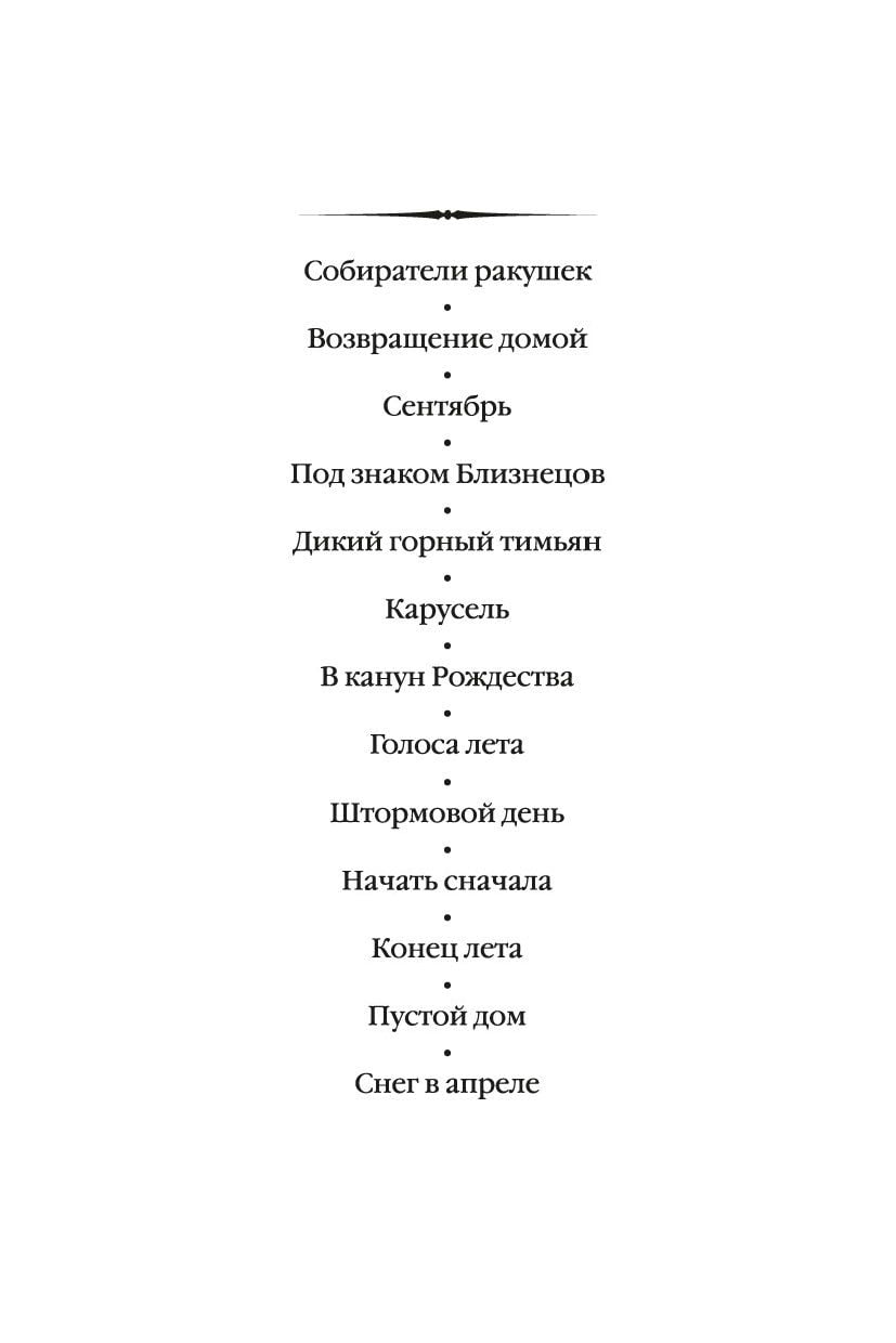 Джейн, героиня романа «Конец лета», приезжает в шотландское родовое имение в надежде повидаться с кузеном, в которого с детства влюблена. Что подарит ей эта встреча, помимо семейных «скелетов в шкафу»?.. Овдовевшая Вирджиния отправляется на ветреное побережье Корнуолла, чтобы поразмышлять о своем не слишком счастливом прошлом и понять, как жить дальше («Пустой дом»). И наконец стать хозяйкой собственной судьбы, сделав важный выбор. Весенняя погода переменчива, особенно в Шотландии, — то солнце, а то вдруг метель («Снег в апреле»). Кэролайн вынуждена сделать остановку в пути из-за снегопада и постучаться в двери чужого дома. День ее свадьбы назначен на следующий вторник, но коварный апрель, похоже, распорядился по-своему... Роман представлен в новом переводе.