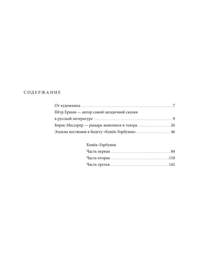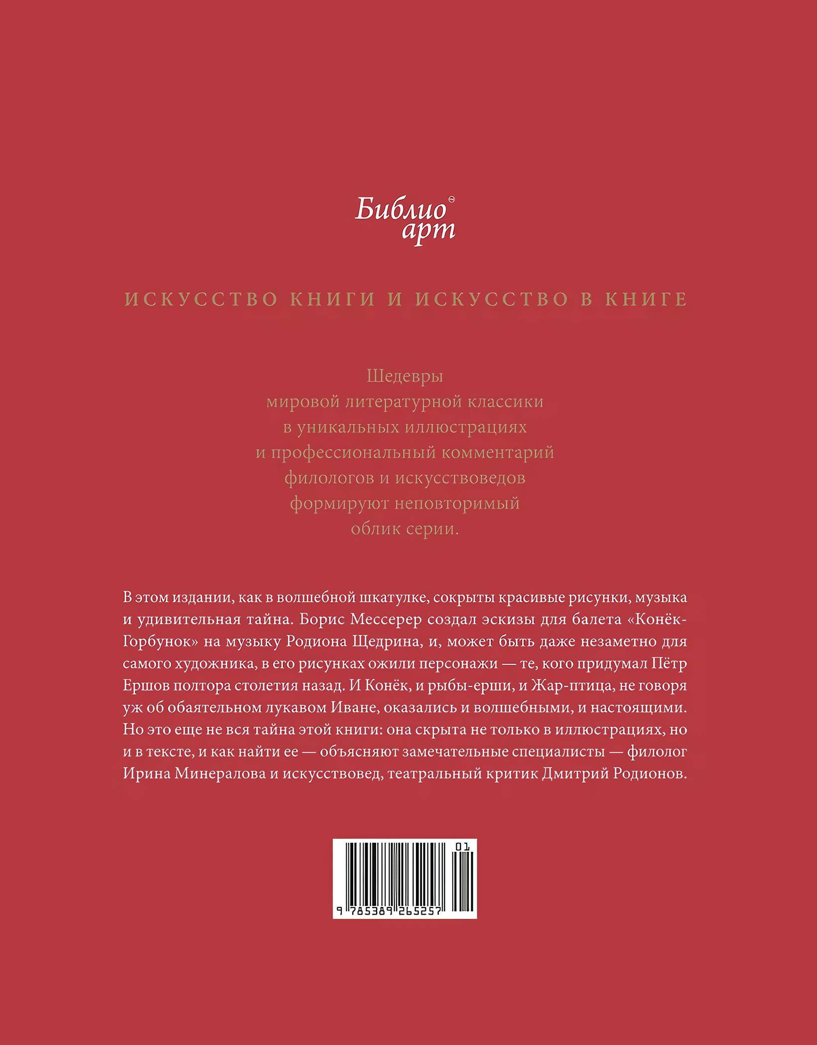 В этом издании как в волшебной шкатулке сокрыты красивые рисунки и музыка, и удивительная тайна. Борис Мессерер создал эскизы для балета «Конёк-Горбунок» на музыку Родиона Щедрина, и, может быть даже незаметно для самого художника, в его рисунках ожили персонажи, те, кого придумал Пётр Ершов полтора столетия назад. И Конёк, и рыбы-ерши, и Жар-птица, не говоря уж об обаятельном лукавом Иване, оказались и волшебными и настоящими. Но это еще не вся тайна этой книги – она скрыта не только в иллюстрациях, но в тексте, и как найти ее – объясняют замечательные специалисты – филолог Ирина Минералова и искусствовед, театральный критик Дмитрий Родионов.