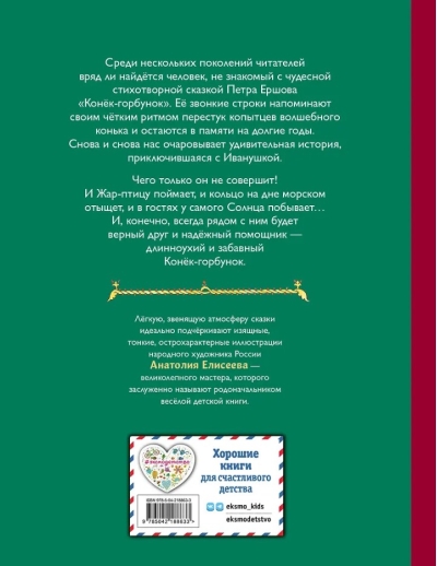 Замечательная поэтическая сказка Петра Павловича Ершова «Конёк-горбунок» приглашает читателей совершить увлекательное путешествие по волшебным царствам и мирам и пережить множество необыкновенных приключений. Звонкие, легко запоминающиеся строчки расскажут о традиционном герое русского фольклора — простодушном Иванушке и о его верном друге, чудесном коньке-горбунке. А тонкие, изящные и точные иллюстрации известного мастера, народного художника России Анатолия Елисеева помогут познакомиться поближе с диковинными существами и подробно рассмотреть все детали необыкновенных странствий.