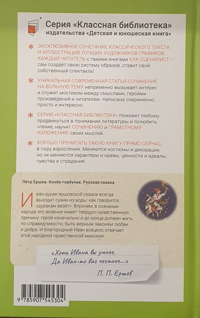 Сказка «Конёк-горбунок», созданная Петром Павловичем Ершовым (1815–1869), давно стала классикой русской детской литературы. Написанная живым народным языком, она часто даже не воспринимается как авторская. На страницах этой книги происходят невероятные чудеса и оживают известные русские персонажи: Иванушка, Жар-птица, Чудо-юдо рыба-кит и другие. Герои попадают в необыкновенные приключения, преодолевают множество преград, но зло обязательно будет наказано, а Иван обретёт своё счастье с прекрасной Царь-девицей. Это сказка о том, что жадность наказуема, а кто-то не слишком красивый внешне может оказаться самым лучшим и надёжным другом. Для младшего и среднего школьного возраста.