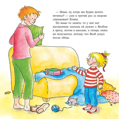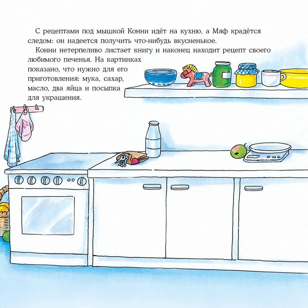 Умение готовить — очень полезный навык. В процессе ребёнок учится работать по инструкции, развивает ловкость и мелкую моторику, лучше начинает разбираться в разных вкусах и продуктах, да и просто становится более самостоятельным. Конни решила сама приготовить печенье, не дожидаясь, пока мама ей в этом поможет. К счастью, у мамы всё-таки нашлось время, и печенье у них получилось вкусное и очень красивое.