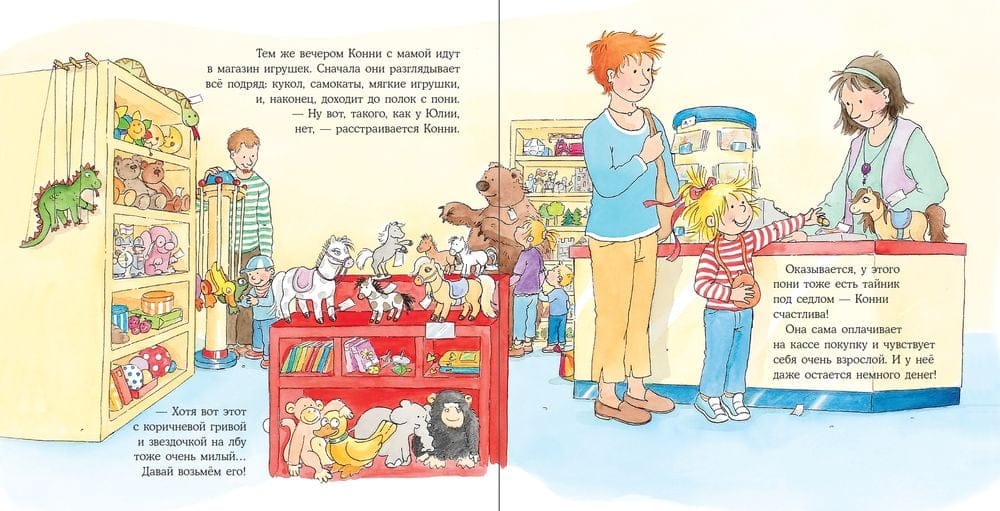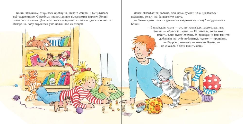 Конни решила, что она уже достаточно большая, чтобы у нее были карманные деньги. Ведь ей хочется купить столько новых игрушек! Но на пару рублей пони не купишь, надо копить.  На примере Конни разберите с малышом, какие у нас в России есть деньги, что такое банковские карты и как с их помощью можно откладывать деньги на новые игрушки.