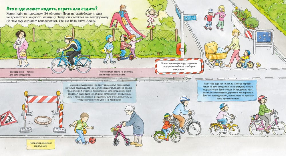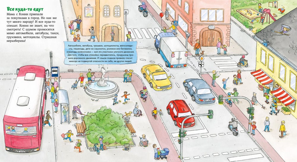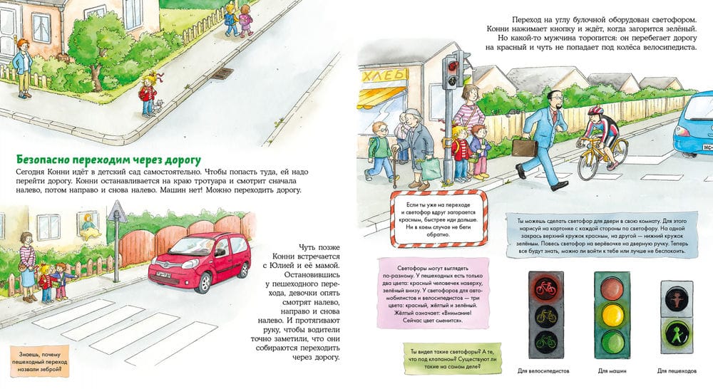 Конни давно уже не капризничает в машине, надевает шлем на велопрогулки и переходит улицу только на зелёный. Она знает, как важна безопасность на дороге, и с радостью расскажет вам о главных правилах дорожного движения. Вместе с Конни ребёнок узнает значение главных знаков дорожного движения, разберётся, где можно ездить на роликах и беговеле, а где нельзя, поймёт, почему так важно пристёгиваться в машине и надевать шлем, когда катаешься на велосипеде. А ещё в книжке с окошками можно заглянуть внутрь грузовика, поезда и автобуса!