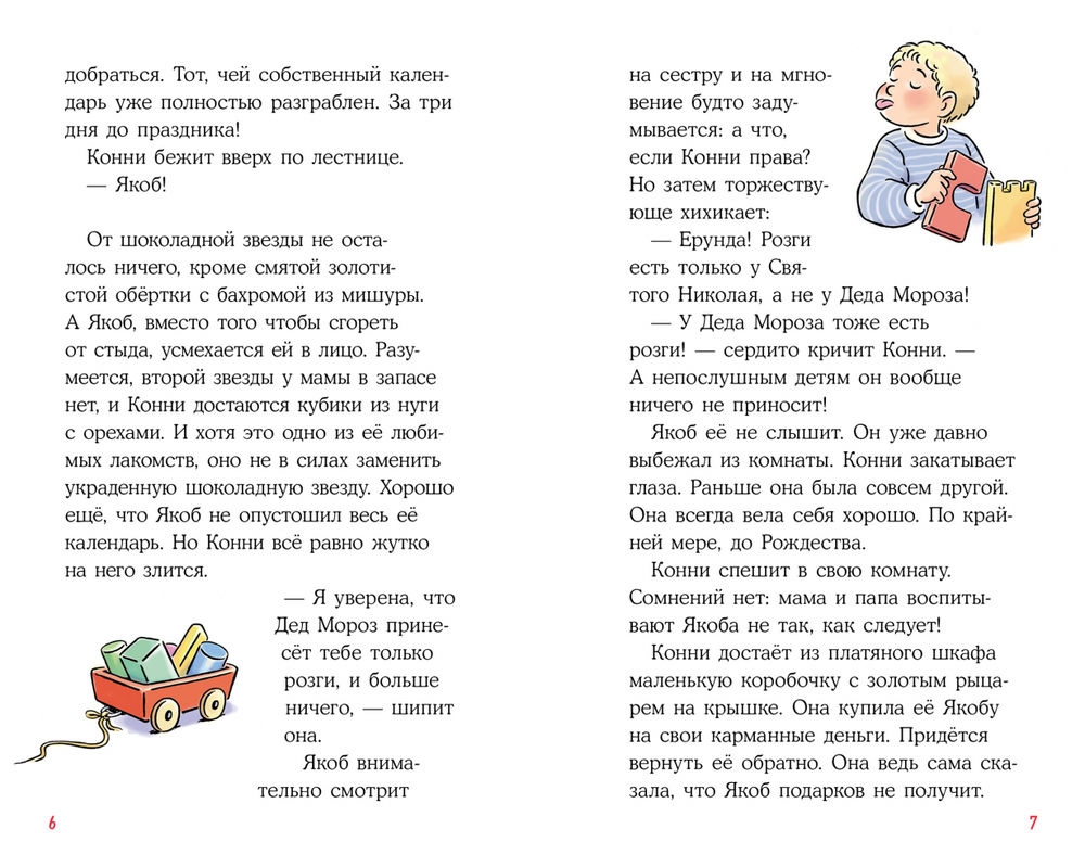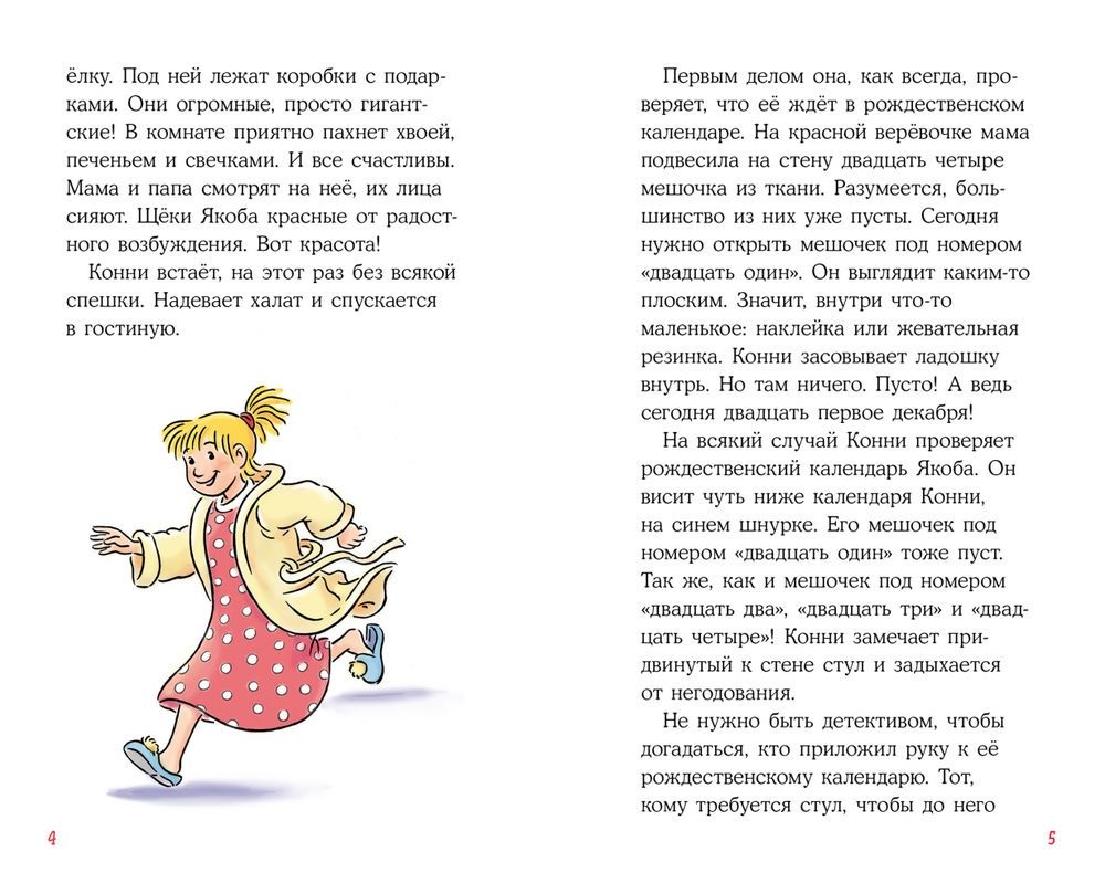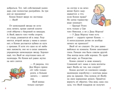Короткие и интересные истории из жизни девочки Конни отлично подойдут для чтения в своё удовольствие ребятами младших классов. Ведь ситуации, в которые попадают герои книг, и то, что они думают и чувствуют, так хорошо знакомы девчонкам и мальчишкам по всему миру. Рождество — волшебный праздник: мама вешает на стену рождественский календарь, под ёлкой появляются подарки, вся семья собирается за праздничным столом... Вот только в этот раз всё пошло наперекосяк: родители поругались, Якоб доводит сестру до белого каления своими капризами, а самой Конни придётся участвовать в рождественском спектакле, хотя там одни первоклашки, а ей уже девять! Удастся ли героине справиться со всеми неприятностями и состоится ли праздник, которого она так долго ждала? Это история о том, как переживать моменты, если вдруг что-то идёт не по плану, и не расстраиваться из-за неудач. Ведь даже самый плохой день может закончиться хорошо!