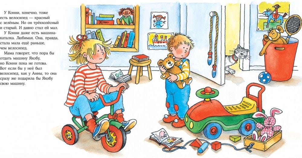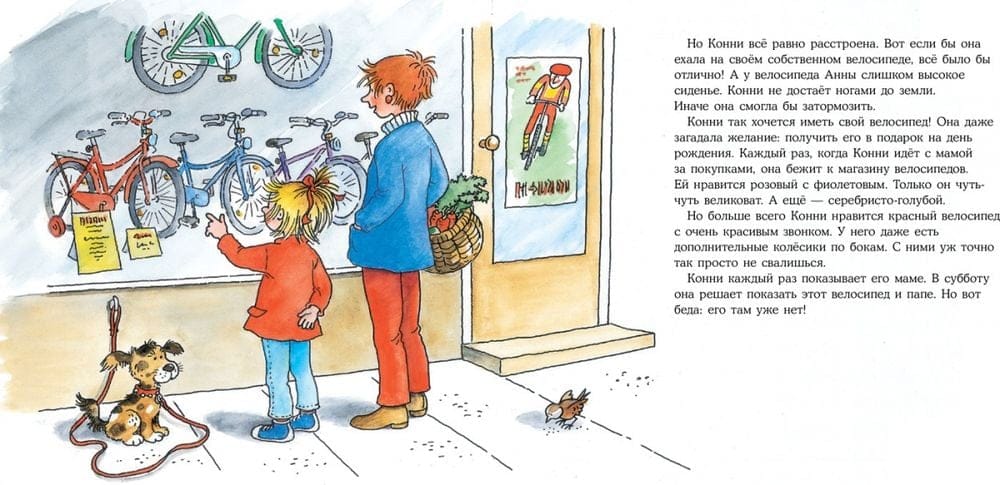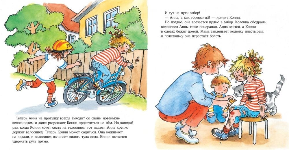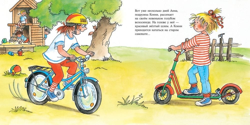 Лето — пора долгих велосипедных прогулок, пикников и гонок по окрестным паркам. Вот и Конни решает научиться кататься на "взрослом" велосипеде, совсем как её подружка Анна. Вместе с Конни ваш ребёнок уверенно поедет на двухколесном велосипеде, справится со своими страхами и откроет для себя новый веломир.    Эта книга поможет ребенку:  •справиться со своей неуверенностью;  •осознать, что не он один набивает шишки, пробуя что-то новое;  •подготовиться к первому практическому занятию на велосипеде;  •запомнить правила безопасности на дороге.    Гид для родителей, или Что вы можете сделать с этой книгой?  - Пробуждайте интерес к чтению.  Малыши такие нетерпеливые, так и норовят поскорее перевернуть страницу, не успев дочитать до конца. В книгах про Конни иллюстрации на каждой страничке, и они точно совпадают с текстом. Ваш малыш сможет считывать историю с картинок.  Учите ребенка читать вместе с Конни!    - Тренируйте речь.  Изучили все иллюстрации? Предложите малышу рассказать, что происходит на картинках. Вот Конни вместе с родителями отправляется на велопрогулку. Что каждый из членов семьи взял с собой? Как думаешь зачем?  Развивайте речь и воображение вместе с Конни.    - Тренируйте память.  Вы уже прочитали историю? Тогда закройте книгу и предложите малышу вспомнить, про что была эта история. На чём каталась Конни, когда была совсем маленькая? Она сразу научилась кататься на велосипеде? Кто ей помогал?  Развивайте память вместе с Конни.    Для детей 3–6 лет.