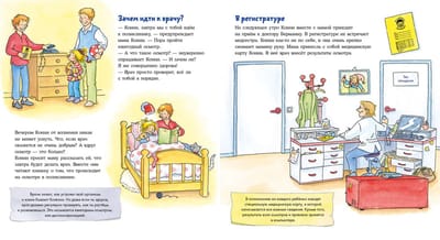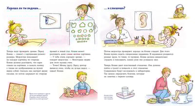 Если заранее подготовить малыша к походу в поликлинику, визит к доктору может пройти довольно спокойно. Конни, например, не боится ходить к врачу. Мама объяснила ей, зачем нужны осмотры, и теперь Конни знает, что это совсем не страшно! Вместе с Конни малыш перестанет бояться докторов и познакомится с разными медицинскими приборами. А ещё в книжке с окошками можно открыть дверь в любой кабинет и даже посмотреть, что лежит у доктора в ящиках!