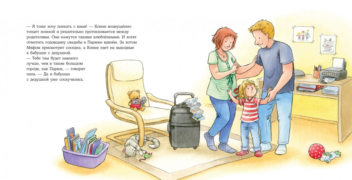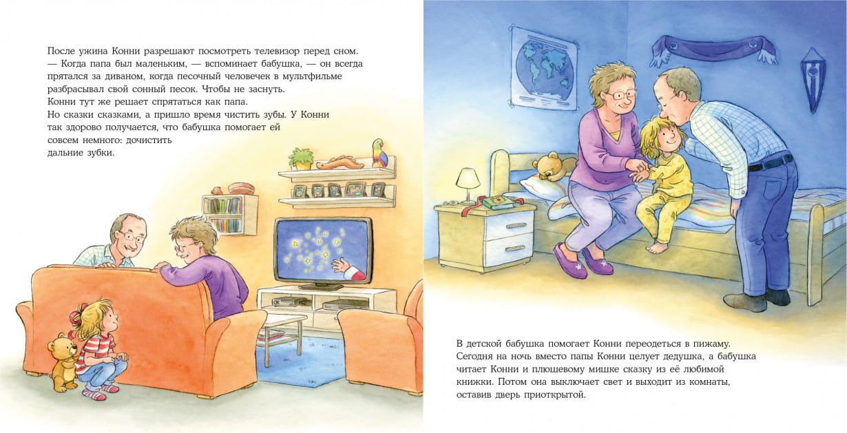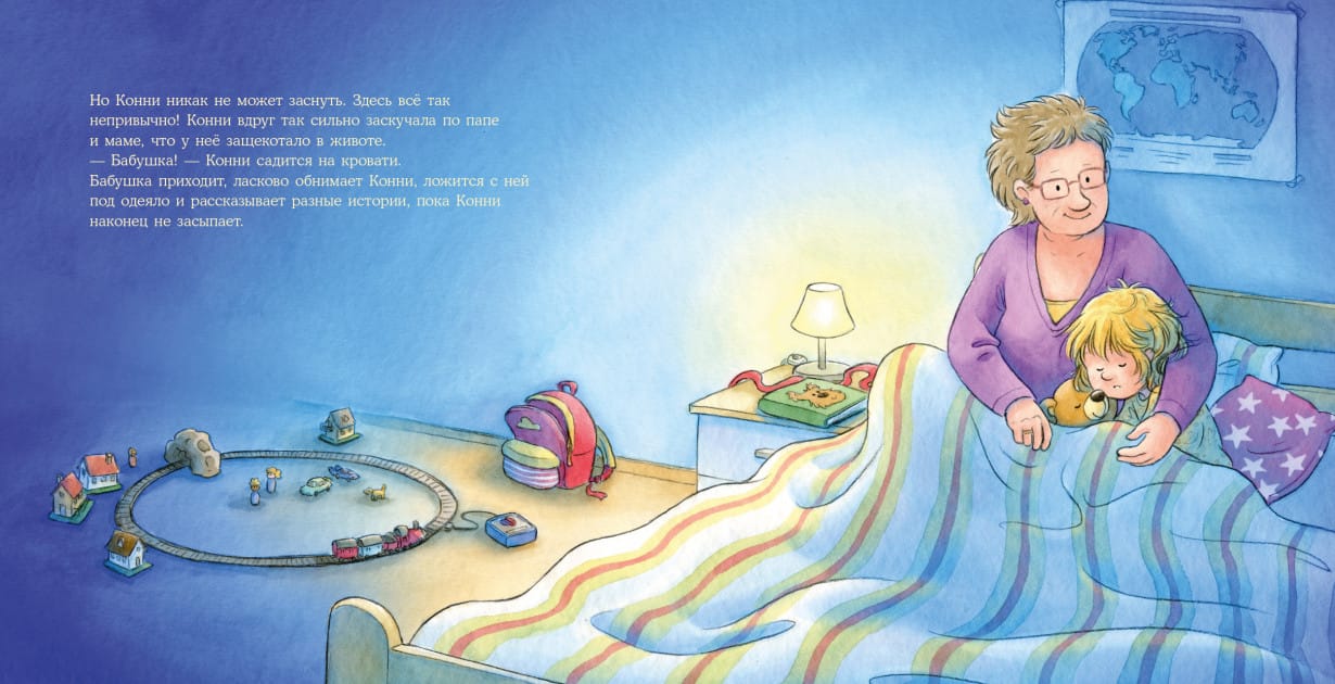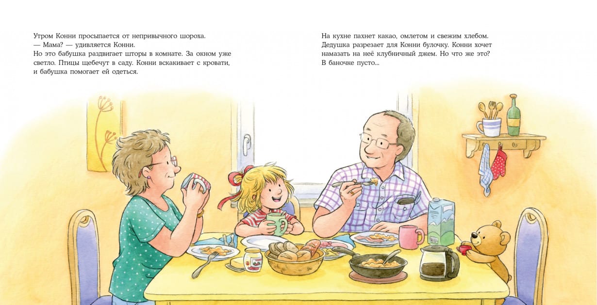 Бывает, что родителям надо куда-то уехать без детей. Тогда на помощь приходят бабушки и дедушки. Вот и Конни отправляется к своим в гости. И не просто так, а с ночёвкой! На все выходные! Прочитайте с малышом эту уютную историю и вспомните, что с бабушкой ничего не страшно, а дедушка знает так много интересных игр, что заскучать не получится ни у кого.