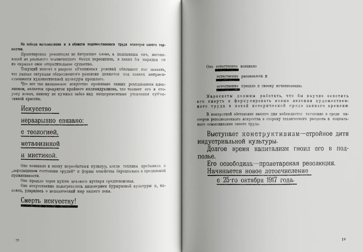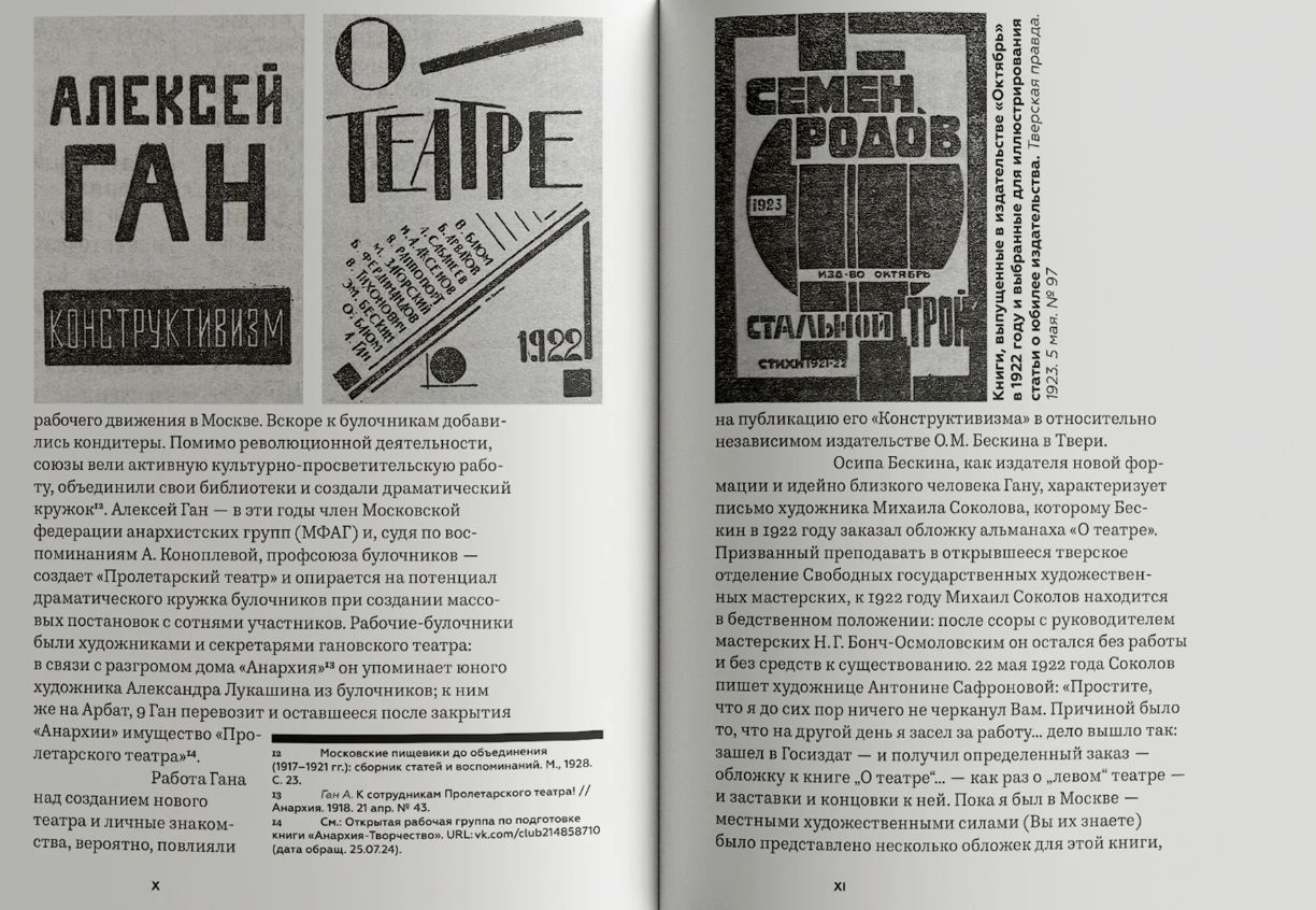 В 1922 году художник, типограф, режиссер, создатель теории конструктивизма Алексей Ган выпустил агитационную брошюру «Конструктивизм» в Тверском издательстве «Октябрь». Этот манифест стал не только первым теоретическим трудом о путях развития нового пролетарского искусства, но и ярким образцом типографского дизайна своего времени. Репринтное издания книги Алексея Гана предваряет статья Ольги Сафоновой, характеризующая исторический контекст и обстоятельства выхода издания на основе архивных документов, периодической печати, воспоминаний современников.