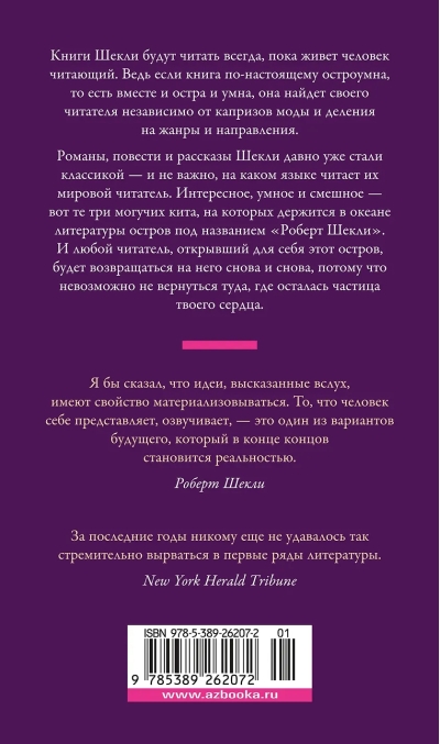 Романы, повести и рассказы Шекли давно уже стали классикой — и не важно, на каком языке читает их мировой читатель. Интересное, умное и смешное — вот те три могучих кита, на которых держится в океане литературы остров под названием «Роберт Шекли». И любой читатель, открывший для себя этот остров, будет возвращаться на него снова и снова, потому что невозможно не вернуться туда, где осталась частица твоего сердца.