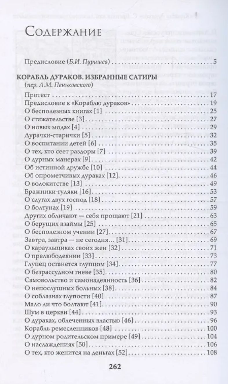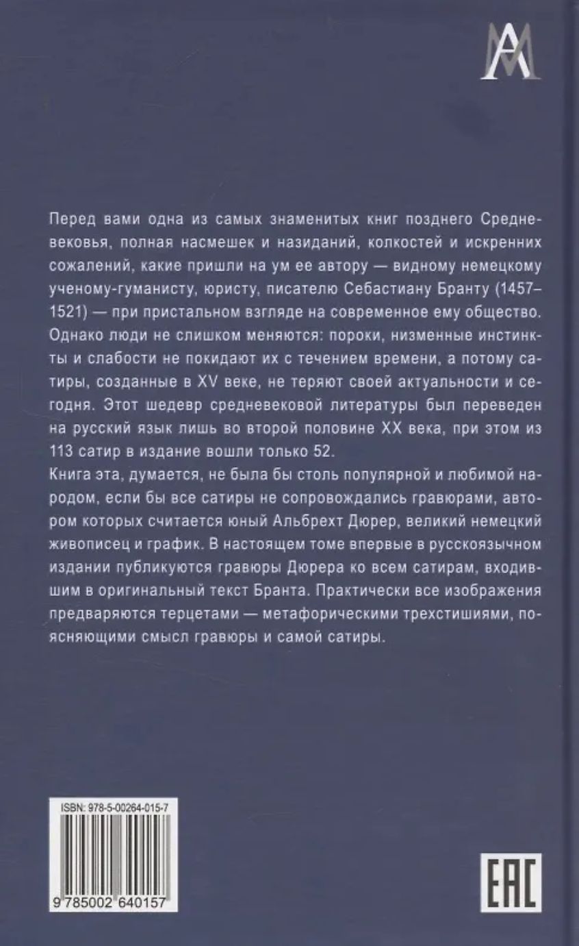 Перед вами одна из самых знаменитых книг позднего Средневековья, полная насмешек и назиданий, колкостей и искренних сожалений, какие пришли на ум ее автору — видному немецкому ученому-гуманисту, юристу, писателю Себастиану Бранту (1457–1521) — при пристальном взгляде на современное ему общество. Однако люди не слишком меняются: пороки, низменные инстинкты и слабости не покидают их стечением времени, а потому сатиры, созданные в XV веке, не теряют своей актуальности и сегодня. Этот шедевр средневековой литературы был переведен на русский язык лишь во второй половине XX века, при этом из 113 сатир в издание вошли только 52.