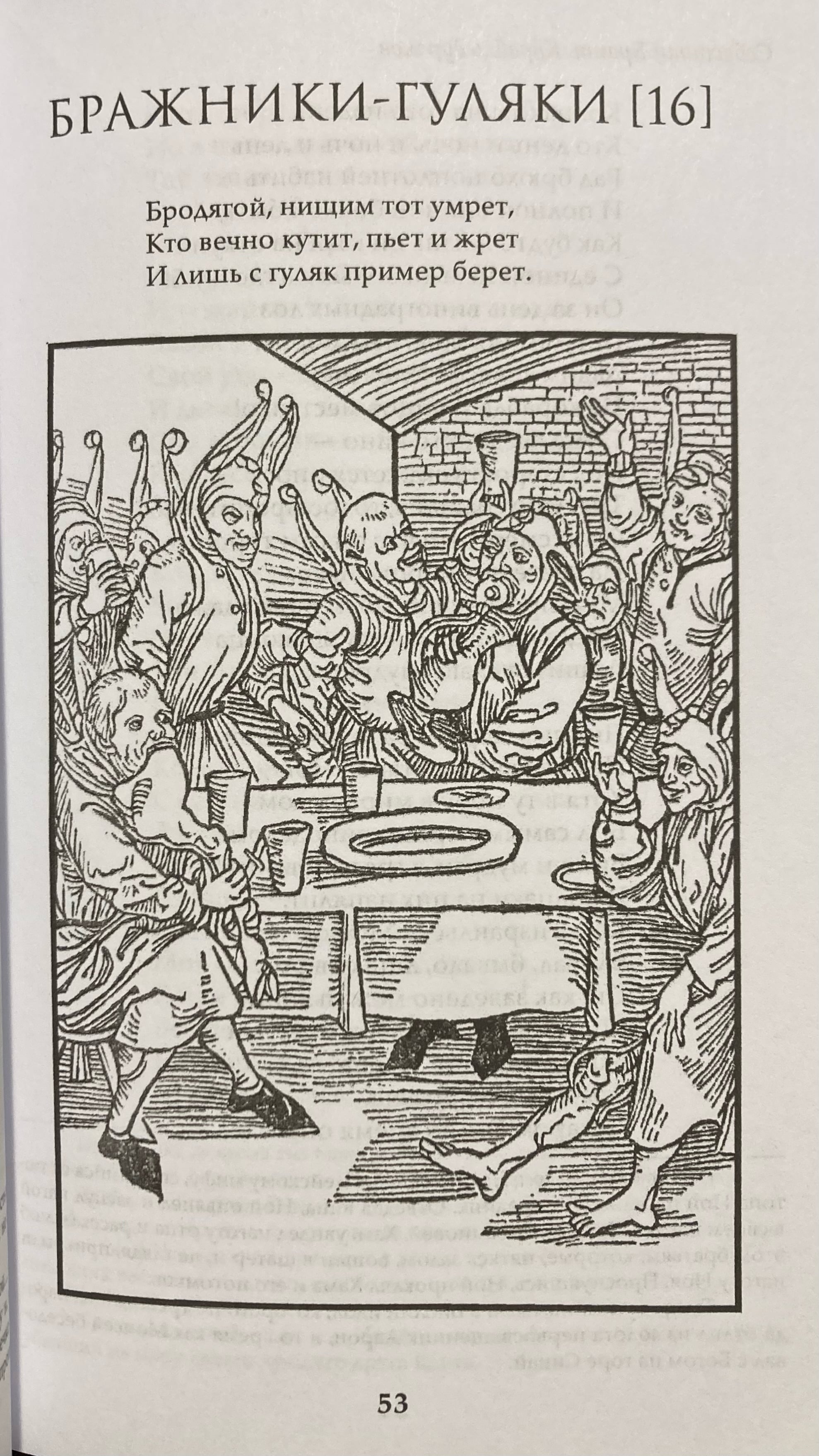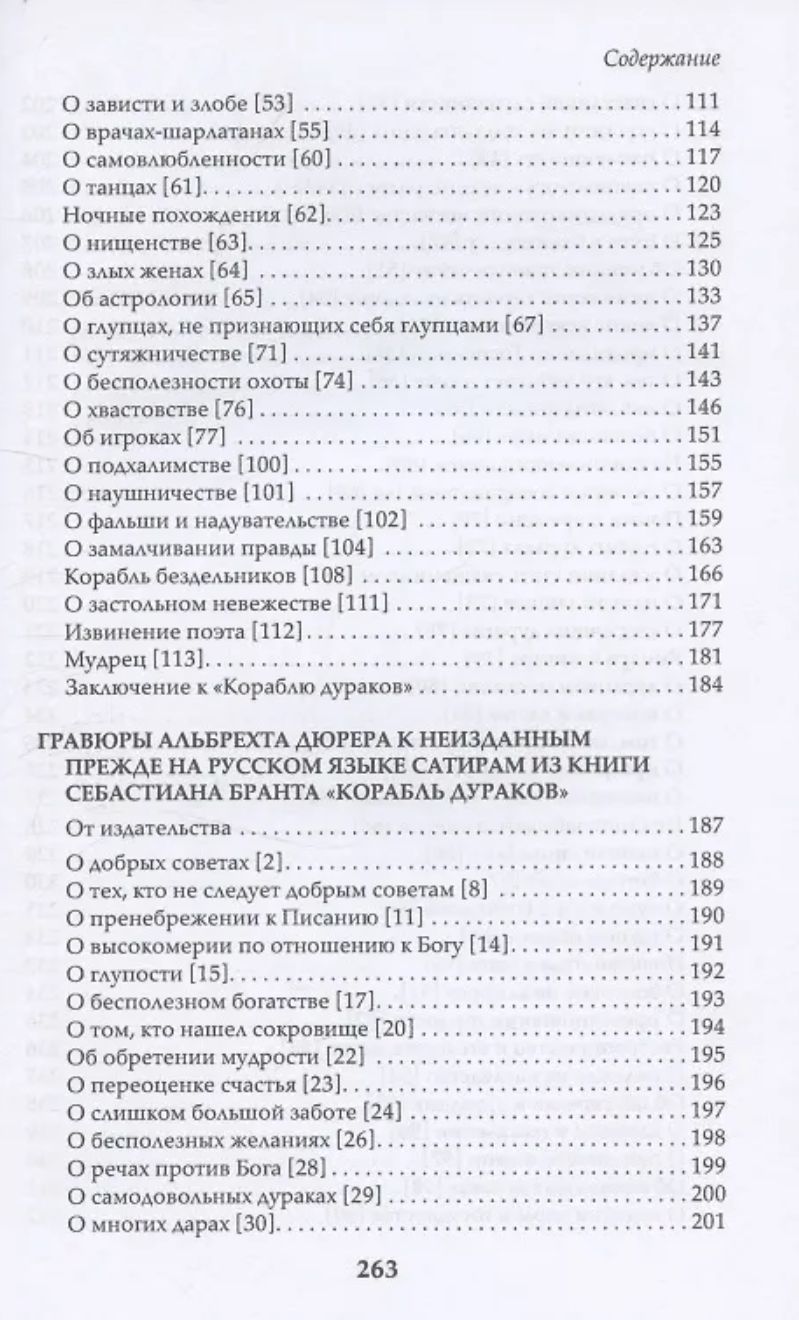 Книга эта, думается, не была бы столь популярной и любимой народом, если бы все сатиры не сопровождались гравюрами, автором которых считается юный Альбрехт Дюрер, великий немецкий живописец и график. В настоящем томе впервые в русскоязычном издании публикуются гравюры Дюрера ко всем сатирам, входившим в оригинальный текст Бранта. Практически все изображения предваряются терцетами — метафорическими трехстишиями, поясняющими смысл гравюры и самой сатиры.