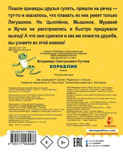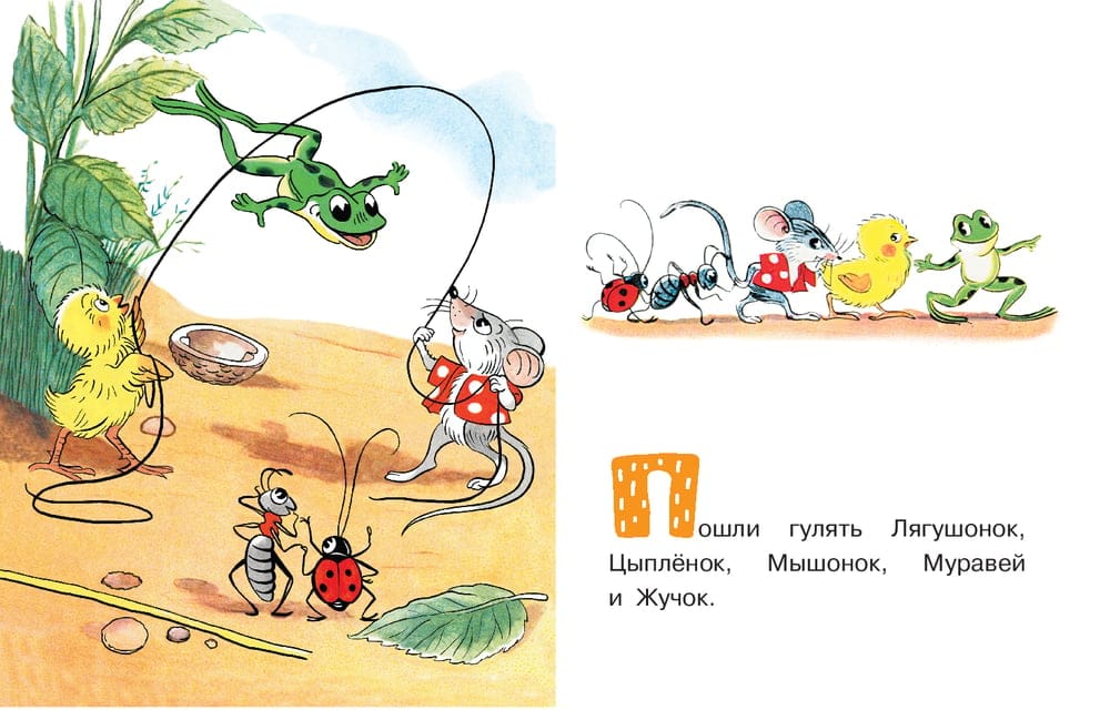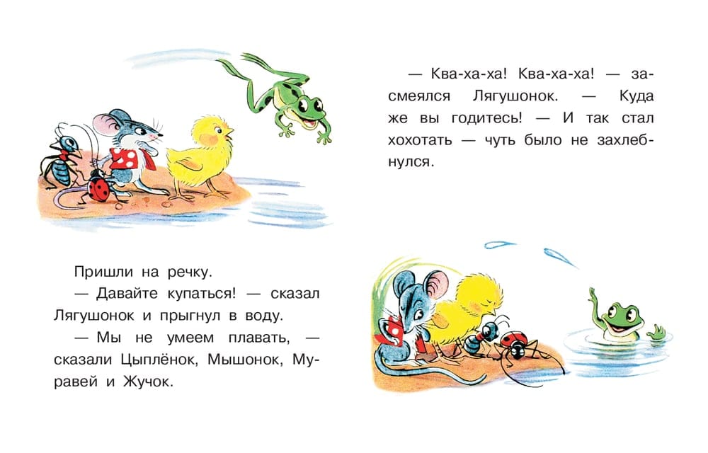 Пошли однажды друзья гулять, пришли на речку – тут-то и оказалось, что плавать из них умеет только Лягушонок. Но Цыплёнок, Мышонок, Муравей и Жучок не расстроились и быстро придумали выход! А что они сделали и как им помогла дружба, вы узнаете из этой книжки!