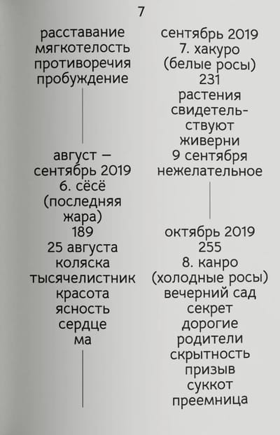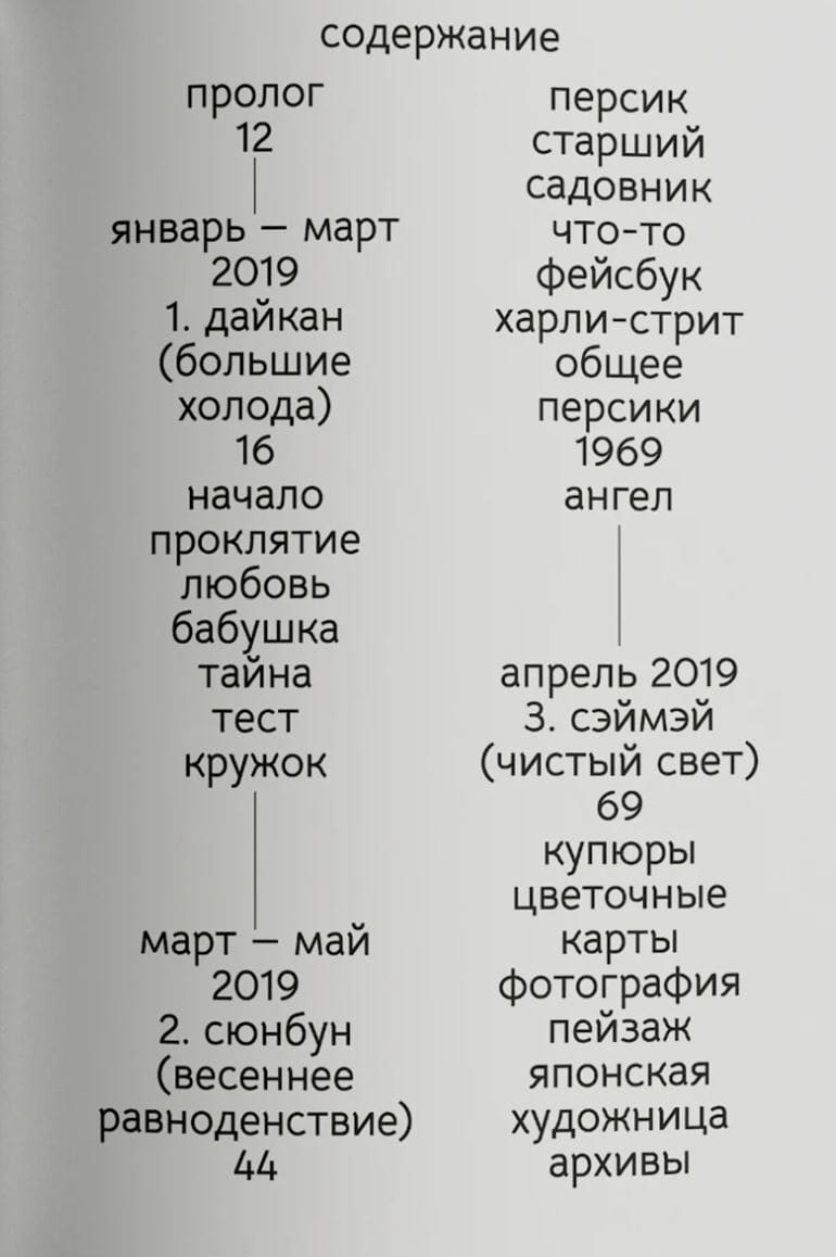 Мать, иммигрантка из Японии, хранит молчание, то ли не в состоянии подобрать нужные слова, то ли не желая ворошить прошлое. В попытках понять мать, увлекающуюся садоводством, героиня обращается к миру цветов и растений. Маклир совершает воображаемое путешествие по садам в своей жизни, следуя за японским календарем, который делится не на времена года, а на двадцать четыре малых сезона — сэкки: чистый свет, холодные росы, хлебные дожди… — чтобы обрести общий язык, который поможет не только разгадать семейную тайну, но и найти ответы на более серьезные вопросы: что такое родство и что значит быть семьей?