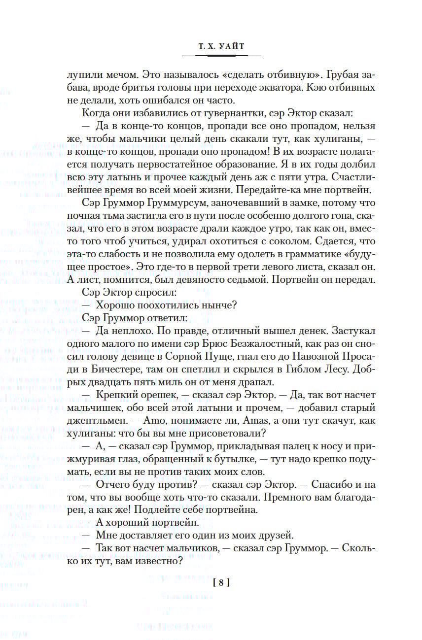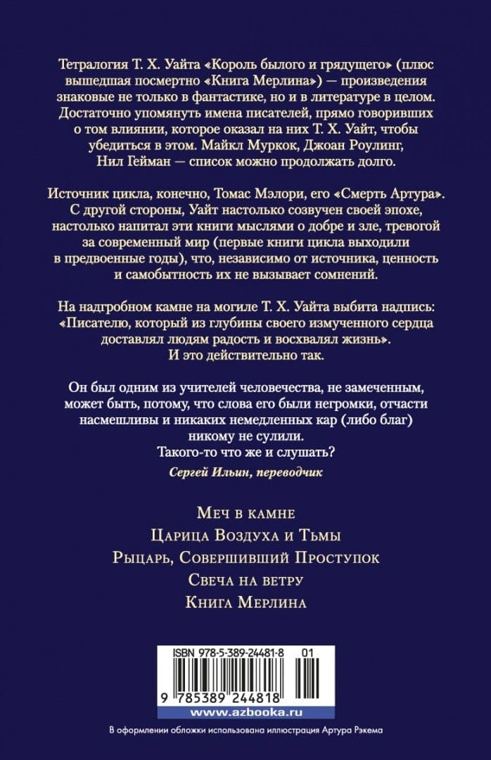 Тетралогия Т. Х. Уайта «Король былого и грядущего» (плюс вышедшая посмертно «Книга Мерлина») — произведения знаковые не только в фантастике, но и в литературе в целом. Достаточно упомянуть имена писателей, прямо говоривших о том влиянии, которое оказал на них Т. Х. Уайт, чтобы убедиться в этом. Майкл Муркок, Джоан Роулинг, Нил Гейман — список можно продолжать долго. Источник цикла, конечно, Томас Мэлори, его «Смерть Артура». С другой стороны, Уайт настолько созвучен своей эпохе, настолько напитал эти книги мыслями о добре и зле, тревогой за современный мир (первые книги цикла выходили в предвоенные годы), что, независимо от источника, ценность и самобытность их не вызывает сомнений. На надгробном камне на могиле Т. Х. Уайта выбита надпись: «Писателю, который из глубины своего измученного сердца доставлял людям радость и восхвалял жизнь». И это действительно так.