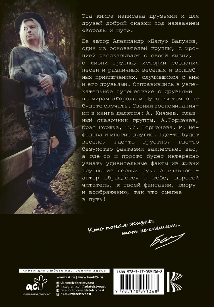 Ее автор Александр "Балу" Балунов, один из основателей группы, с иронией рассказывает о своей жизни, о жизни группы, истории создания песен и различных веселых и волшебных приключениях, случившихся с ним и его друзьями. Отправившись в увлекательное путешествие с друзьями по мирам "Король и Шут" вы точно не будете скучать. Своими воспоминаниями в книге делятся: А. Князев, главный сказочник группы, А. Горшенев, брат Горшка, Т.И. Горшенева, М. Нефедова и многие другие. Где-то будет весело, где-то грустно, где-то безумство фантазии захлестнет вас, а где-то и просто будет интересно узнать удивительные факты из жизни группы из первых рук. А главное – автор обращается к тебе, дорогой читатель, к твоей фантазии, юмору и воображению, так что смелее в путь!