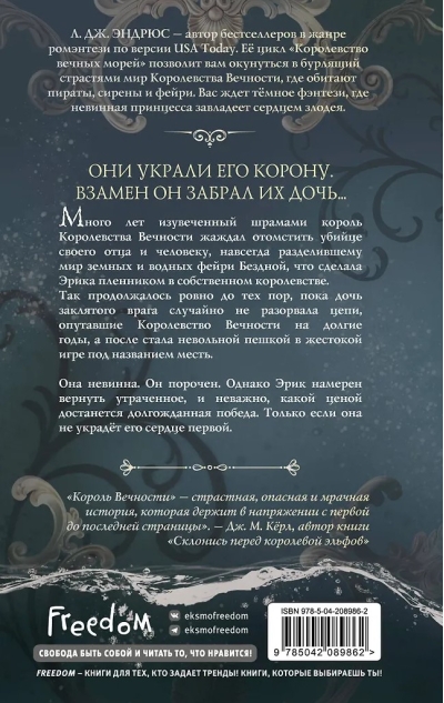 Первая книга новой трилогии Л. Дж. Эндрюс. Добро пожаловать в бурлящий страстями мир Королевства Вечности, где обитают пираты, сирены и фейри. Вас ждет темное фэнтези, где невинная принцесса завладеет сердцем злодея.