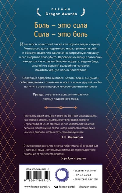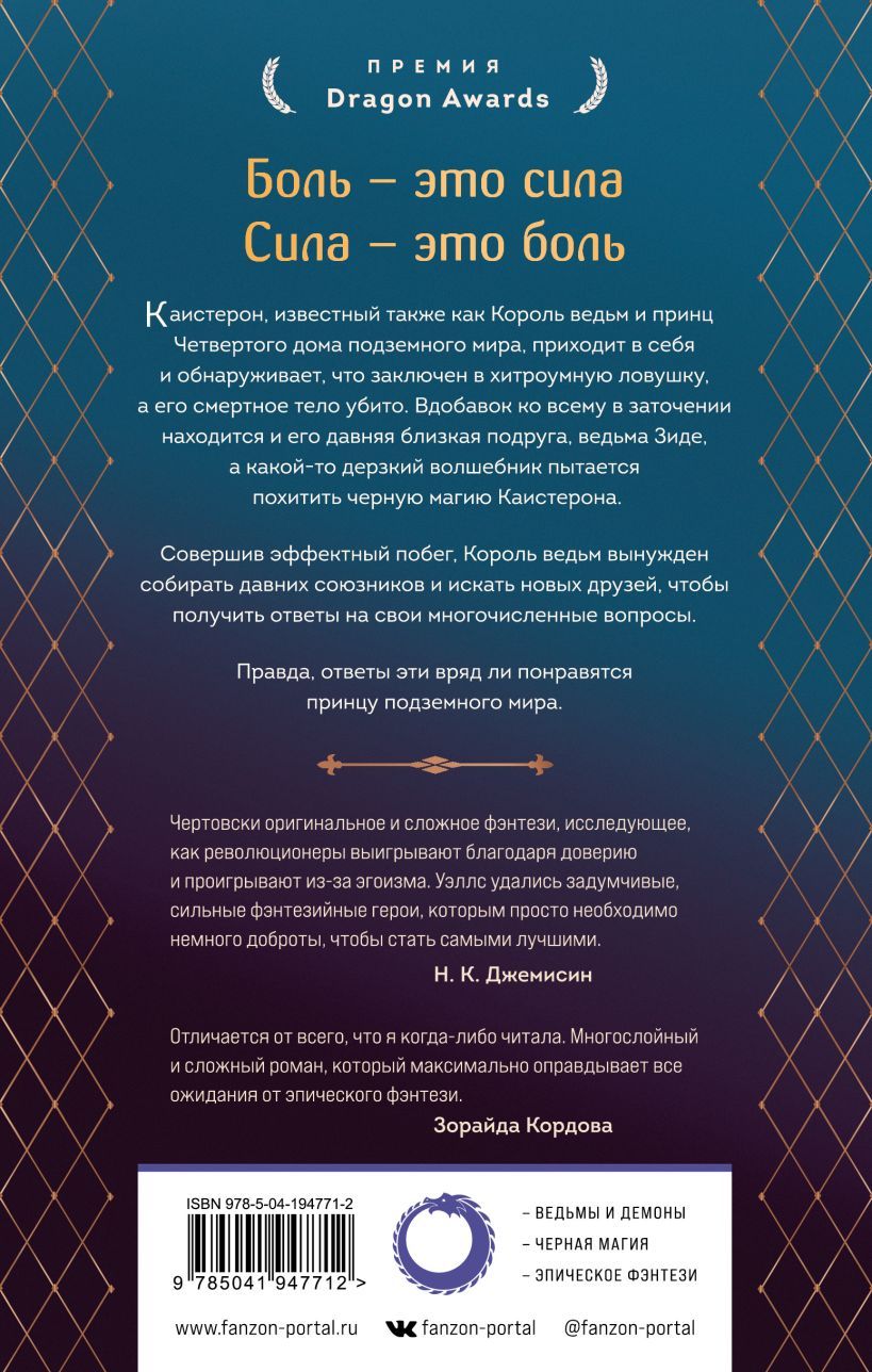 Когда Король ведьм и принц Четвертого дома подземного мира Каистерон (или просто Каи для могущественных друзей и необычных родственников), просыпается и обнаруживает себя пленником в магической ловушке, первый вопрос, который у него возникает: как он вообще в нее попал? Узнав, что в ловушку также заключена ведьма Зиде, его ближайший союзник, Каи совершает эффектный побег не только из своих пут, но и из своего тела. Это не первый раз, когда он проделывает такой трюк. Мы узнаем об этом из хитро сплетенного повествования, которое объединит историю прошлого с захватывающими событиями настоящего. В число противников Каи входят владеющие магией толкователи, ужасающие монстры, надменные воины-арайки, коварные политики и невообразимо могущественные волшебники-чужеземцы, стремящиеся к мировому господству. Сбитый с толку, Каи оказывается в состоянии войны как со своей демонической природой, так и со своими врагами. Ему придется полагаться на старых союзников и недавно приобретенных друзей, чтобы разгадать все тайны своего врага. По мере того, как постепенно раскрывается заговор на самых высших уровнях Зарождающегося мира, империи, которую помог создать в свое время Каи, вопросов становится больше, чем ответов, а опасность неимоверно возрастает. «Король ведьм» — новый роман Марты Уэллс. Впервые более чем за десять лет она вернулась в жанр фэнтези, некогда сделавший ее одной из важнейших писательниц поколения. Фирменная способность Марты Уэллс как автора — создавать очаровательных персонажей, которые заставляют любить себя и с которыми мы себя идентифицируем, отправлять их в захватывающие приключения.