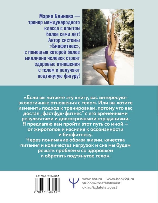 Тренировки до изнеможения. Страдать от боли в мышцах, но заниматься. Все пункты выполняете, а вместо кубиков получаете накопленную усталость и боли в теле. Как разорвать этот круг? Как получить подтянутое и здоровое тело и избавиться от болей? Просто откройте эту книгу! Автор — тренер международного класса с опытом более семи лет — помог уже более чем миллиону человек. Вместе с ним вы: - узнаете, как устроен ваш организм и как все в нем взаимосвязано; - поймете, как получить подтянутое тело без вреда для здоровья, без диет и изнеможения; - сможете избавиться от болей в мышцах и суставах; - получите готовую систему видеотренировок для проработки всех зон тела. Авторская концепция «Биофитнес» — это здоровые отношения с телом, когда тренировка предполагает не только физическую нагрузку, но и осознанность. Это узнавание и понимание своего тела, сознательное чувствование. Готовы попробовать? Не является учебником по медицине. Все рекомендации должны быть согласованы с лечащим врачом.