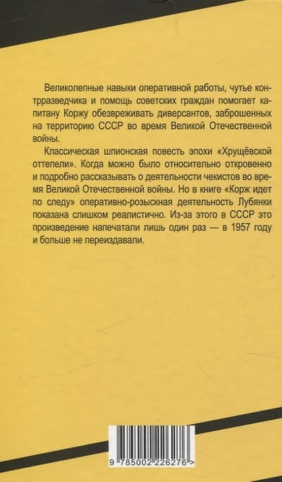 Великолепные навыки оперативной работы, чутье контрразведчика и помощь советских граждан помогает капитану Коржу обезвреживать диверсантов, заброшенных на территорию СССР во время Великой Отечественной войны. Классическая шпионская повесть эпохи «Хрущёвской оттепели». Когда можно было относительно откровенно и подробно рассказывать о деятельности чекистов во время Великой Отечественной войны. Но в книге «Корж идет по следу» оперативно-розыскная деятельность Лубянки показана слишком реалистично. Из-за этого в СССР это произведение напечатали лишь один раз — в 1957 году и больше не переиздавали.