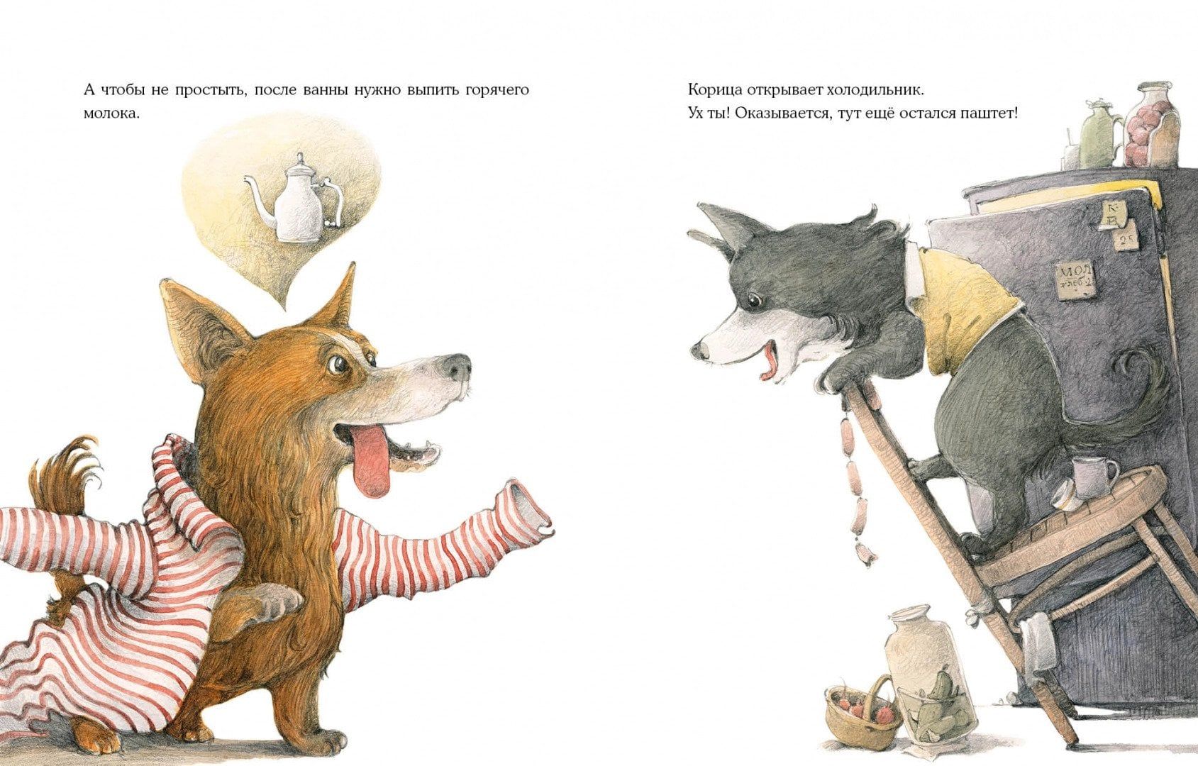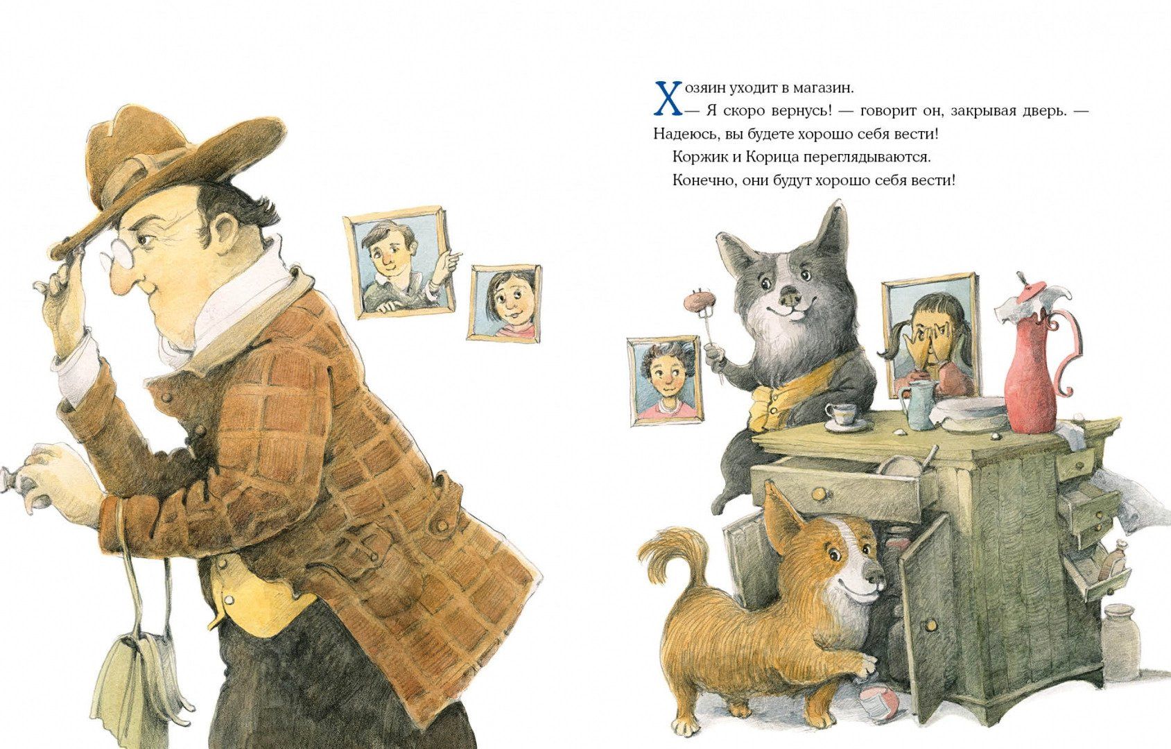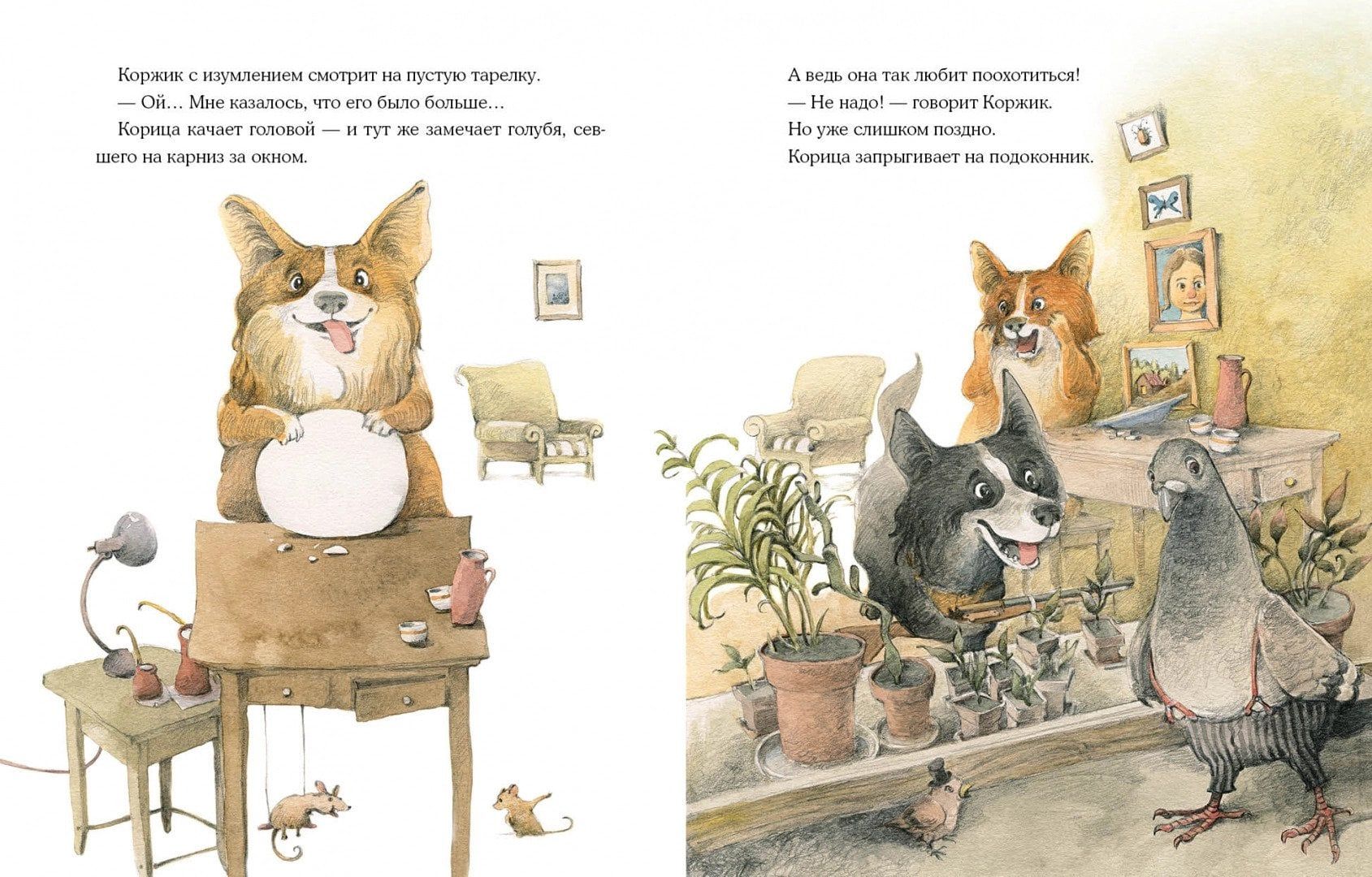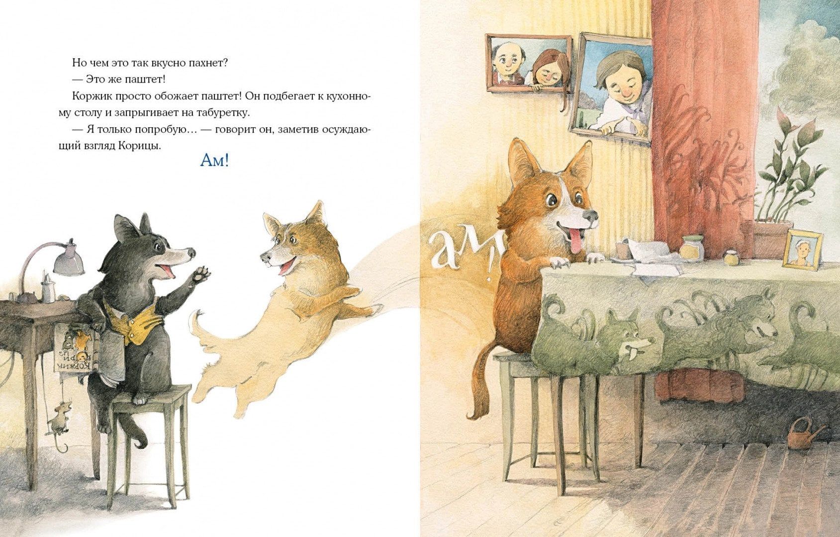 Однажды две весёлые собачки Коржик и Корица остались дома без хозяина. И что тут началось! Друзья полакомились паштетом, разбили цветочные горшки, разлили краску, да ещё и нашли применение хозяйской рубашке… И всё-таки они старались вести себя хорошо, хотя делать это одним им оказалось очень трудно!  Очаровательные иллюстрации художника Валерия Козлова дополняют забавную историю и делают её героев ещё более потешными.