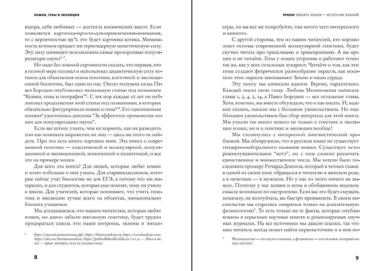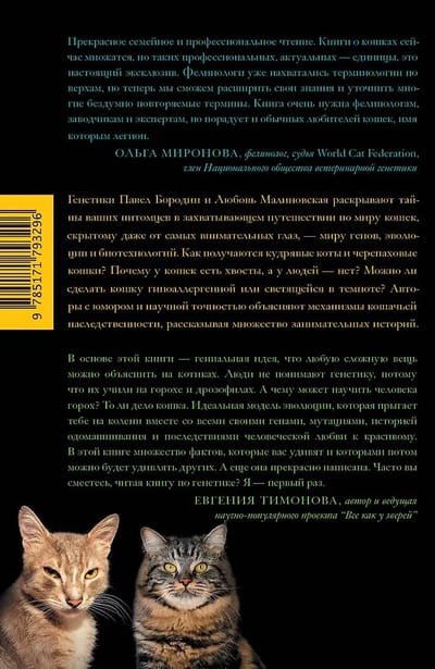 В книге «Кошки, гены и эволюция» генетики Павел Бородин и Любовь Малиновская доступно, иронично и без малейшего ущерба для научной точности рассказывают о генах, эволюции и селекции домашней кошки. Авторы рассматривают молекулярно-генетические основы окраски и структуры шерсти, породных особенностей и наследования многих полюбившихся человеку кошачьих признаков. В книге можно найти самые свежие данные о происхождении тигров, гепардов и других кошачьих, об одомашнивании кошек и истории возникновения их пород, о перспективах создания дизайнерских котов благодаря геномному редактированию и другим современным биотехнологиям.