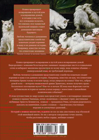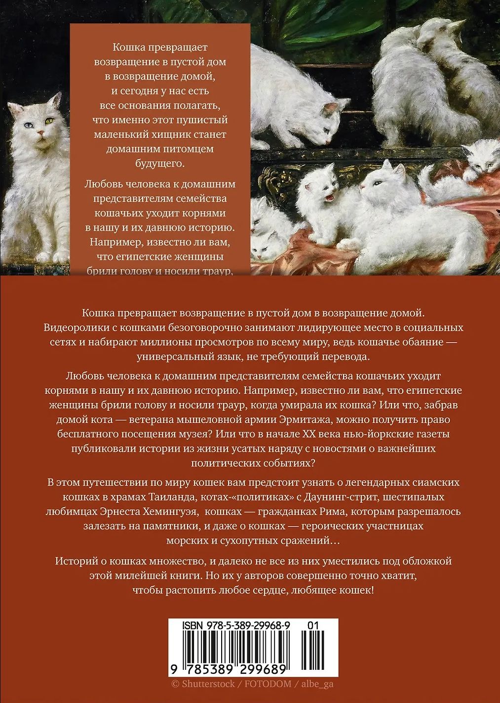 В этом путешествии по миру кошек вам предстоит узнать о легендарных сиамских кошках в храмах Таиланда, котах-«политиках» с Даунинг-стрит, шестипалых любимцах Эрнеста Хемингуэя, кошках — гражданках Рима, которым разрешалось залезать на памятники, и даже о кошках — героических участницах морских и сухопутных сражений.