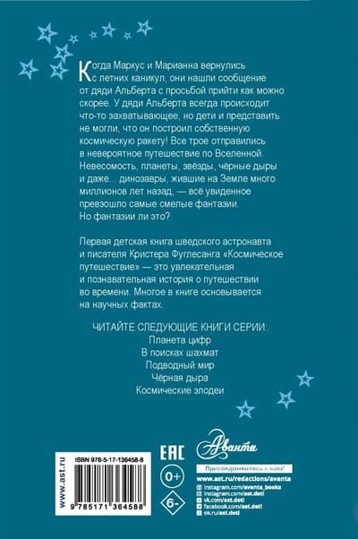 Книга шведского астронавта и писателя Кристера Фуглесанга «Космические путешествия» — первая из шести увлекательнейших сказок о приключениях учёного дяди Альберта и детей – Маркуса и Марианны. Герои этой книги совершат удивительное и познавательное путешествие по Вселенной, познакомятся с планетами, звёздами и чёрными дырами и даже… окажутся на Земле во время динозавров! Многое в этой истории основано на реальных фактах, о которых автор расскажет в конце книги. Для младшего школьного возраста.