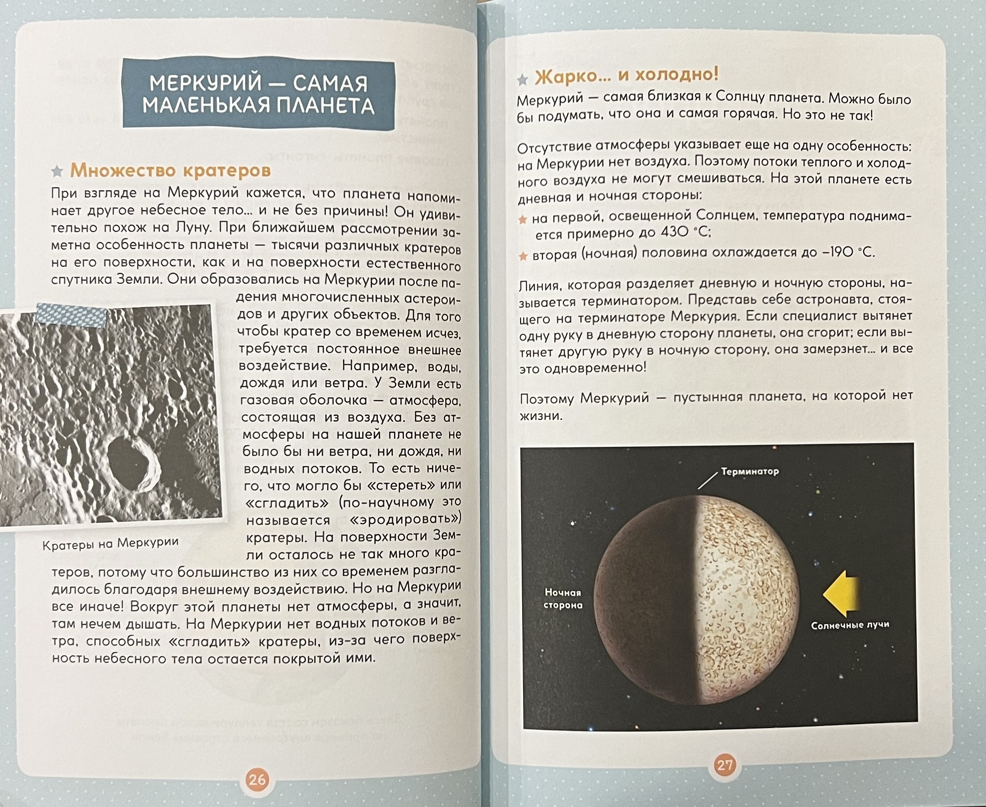 На ночном небе можно увидеть далекие звезды и планеты. Завораживающе, не правда ли? Эта книга расскажет о небесных телах, находящихся в Солнечной системе. Ты рассмотришь Луну, астероиды, кометы, прочитаешь про температуру на поверхности восьми планет, а еще узнаешь, что такое гравитация, какой самый крупный искусственный спутник Земли и когда было открыто Большое Красное Пятно. Соверши удивительное путешествие по Солнечной системе и стань настоящим экспертом по астрономии.