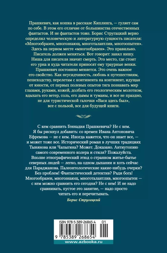 Прашкевич, как кошка в рассказе Киплинга, — гуляет сам по себе. В этом его отличие от большинства отечественных фантастов. И не фантастов тоже. Борис Стругацкий верно определил человеческую и литературную сущность писателя: «многообразен, многознающ, многоталантлив, многоопытен». Здесь на первом месте «многообразен». Это правильно. Писатель должен меняться. Вот говорят: занял нишу. Ниша для писателя значит смерть. Это место, где стоит его урна и куда читатели приносят ему траурные венки.