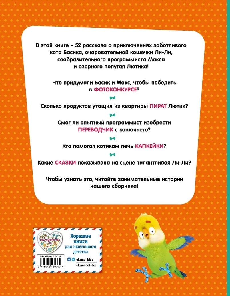 В книге собрано 52 увлекательных рассказа про сообразительного кота Басика, милую кошечку Ли-Ли, жизнерадостного программиста Макса и озорного попугая Лютика! Какие сказки показывала на сцене талантливая Ли-Ли? Смог ли опытный программист изобрести переводчик с кошачьего? Кто помогал котикам печь капкейки? Чтобы узнать это, читайте весёлые и занимательные рассказы из нашего сборника!