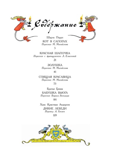 В наш сборник вошли самые известные сказки: «Кот в сапогах», «Золушка», «Красная шапочка», «Спящая красавица» (Шарль Перро), «Бабушка Вьюга» (Братья Гримм), «Дикие лебеди» (Х. К. Андерсен).