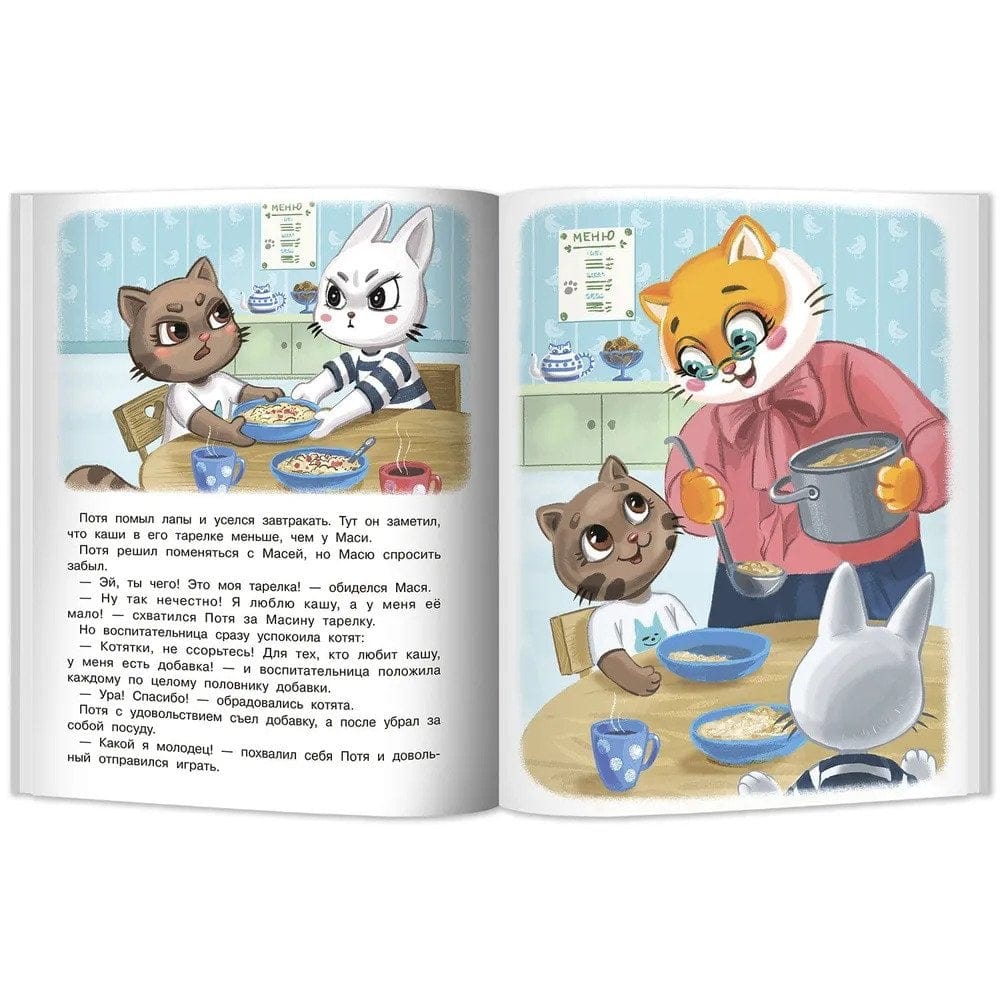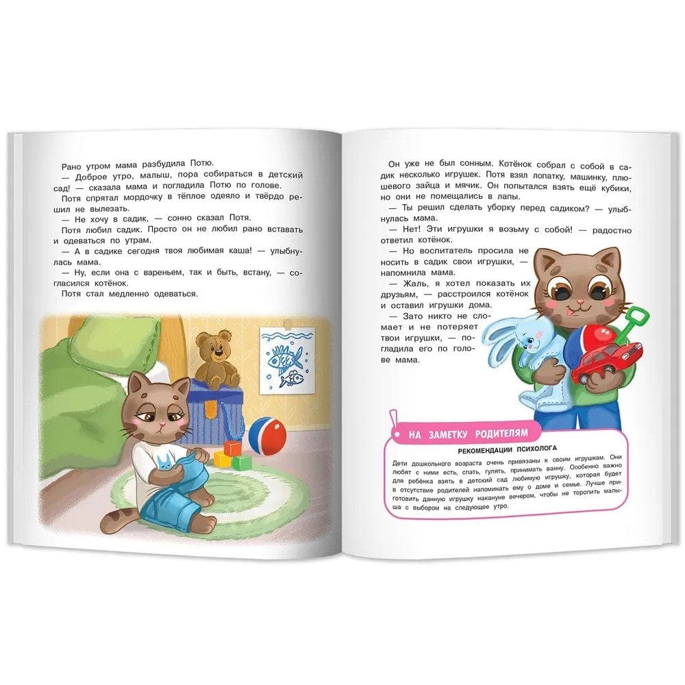 Книжка из серии про очаровательного котёнка Потю, который учится быть самостоятельным, учится дружить, учится всему новому с удовольствием и прилежанием, в этой истории мы расскажем про одно из значимых событий в жизни ребёнка – поступление в детский сад. Слушая познавательную историю, ребёнок невольно будет ассоциировать себя с милым котёнком, и тем самым книга послужит помощником в адаптации малыша к детскому саду. Для вашего удобства в книге приведены рекомендации детского психолога, которые обратят внимание родителей на важные моменты воспитания.