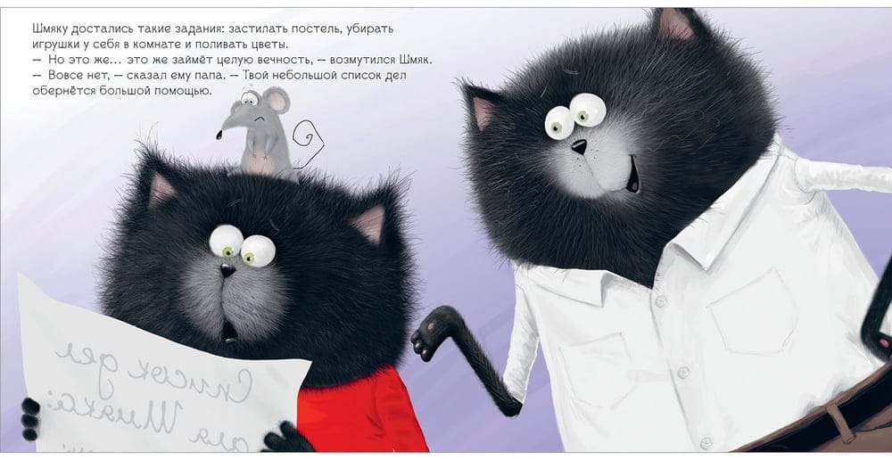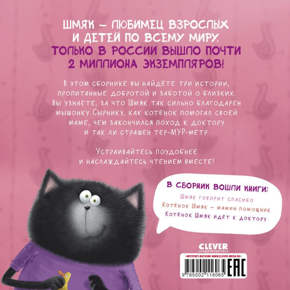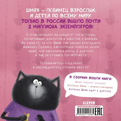 В этом сборнике вы найдёте три истории, пропитанные добротой и заботой о близких. Вы узнаете, за что Шмяк так сильно благодарен мышонку Сырнику, как котёнок помогал своей маме, чем закончился поход к доктору и так ли страшен тер-МУР-метр. Устраивайтесь поудобнее и наслаждайтесь чтением вместе.