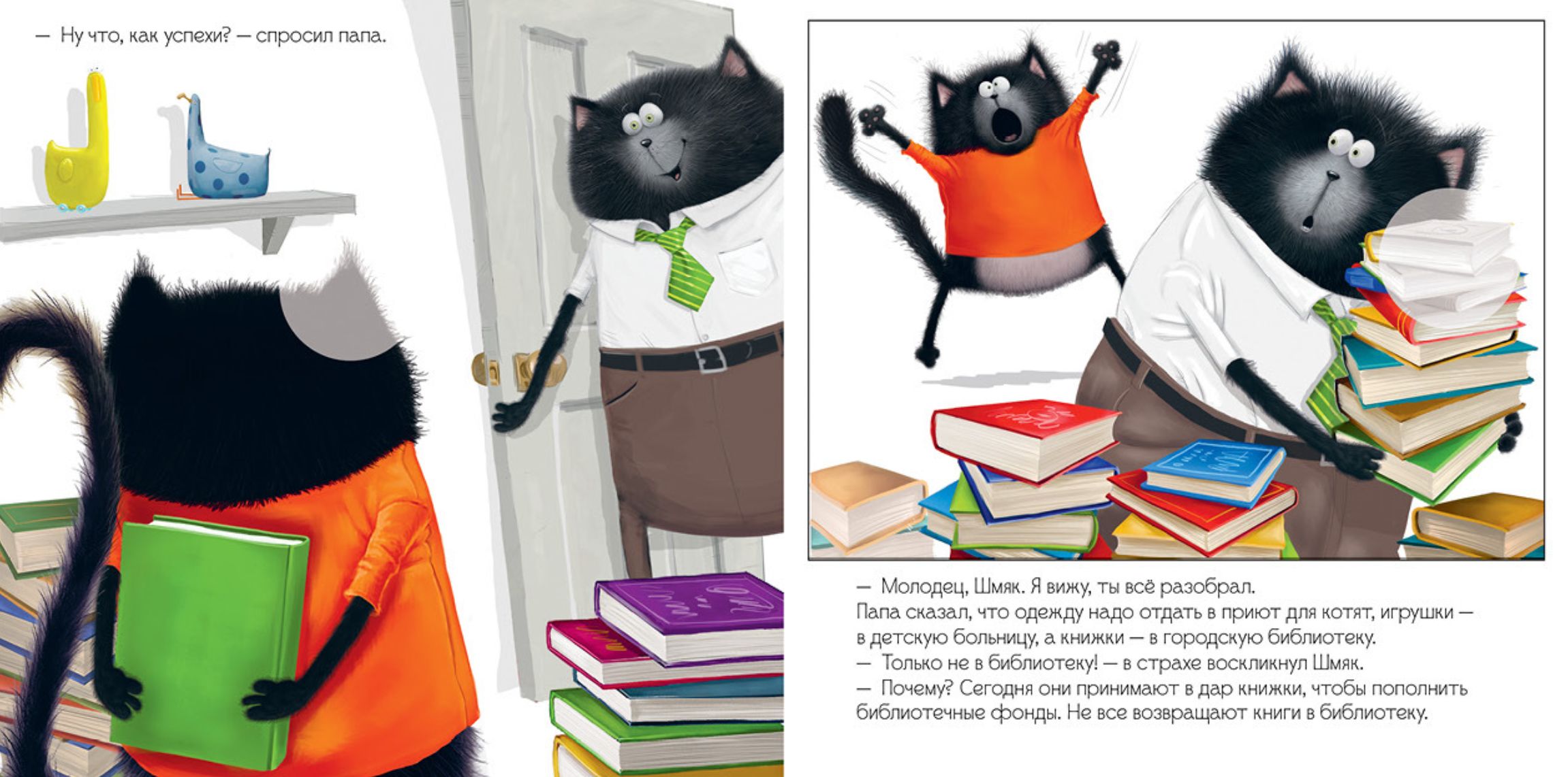 Сюжет истории очень неожиданный. Шмяк разбирает свой забитый шкаф, чтобы раздать ненужные вещи, и находит книжку, которую забыл сдать в библиотеку. Шмяк нарушил закон? Его посадят в кошачью тюрьму? Или отдадут на съедение акулам? Или заставят заплатить огромный штраф! А в копилке у Шмяка всего одна монетка… Что же делать котенку? Как он выйдет из положения, признается ли в том, что забыл сдать библиотечную книжку?