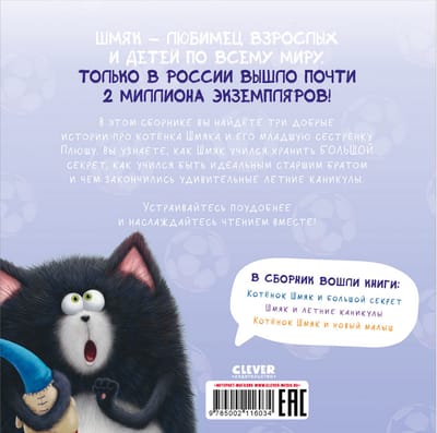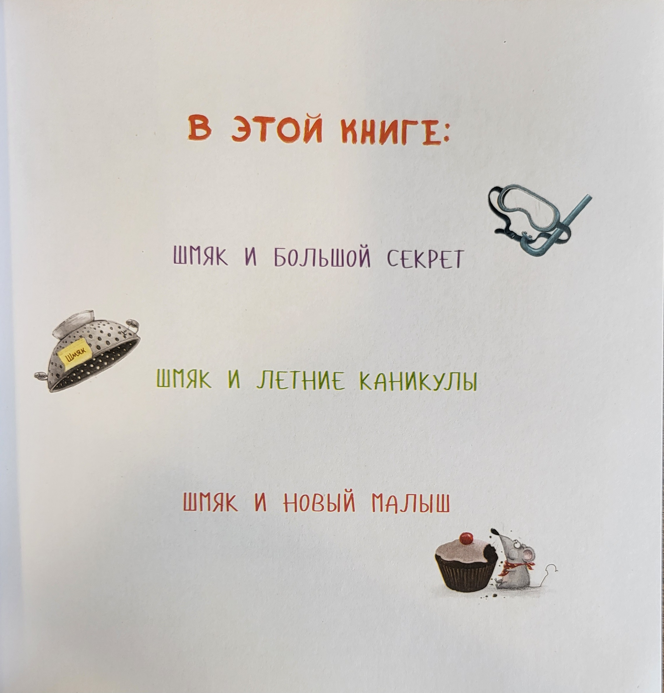 В этом сборнике вы найдёте три добрые истории про котёнка Шмяка и его младшую сестрёнку Плюшу. Вы узнаете, как Шмяк учился хранить большой секрет, как учился быть идеальным старшим братом и чем закончились удивительные летние каникулы.