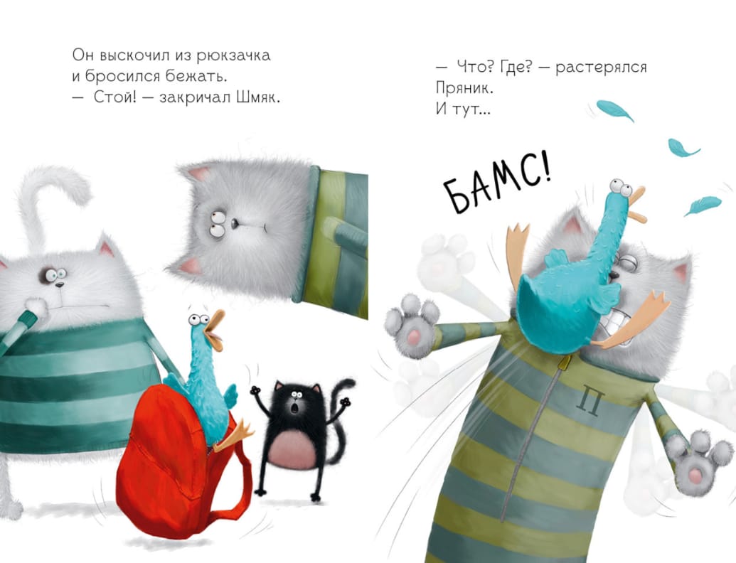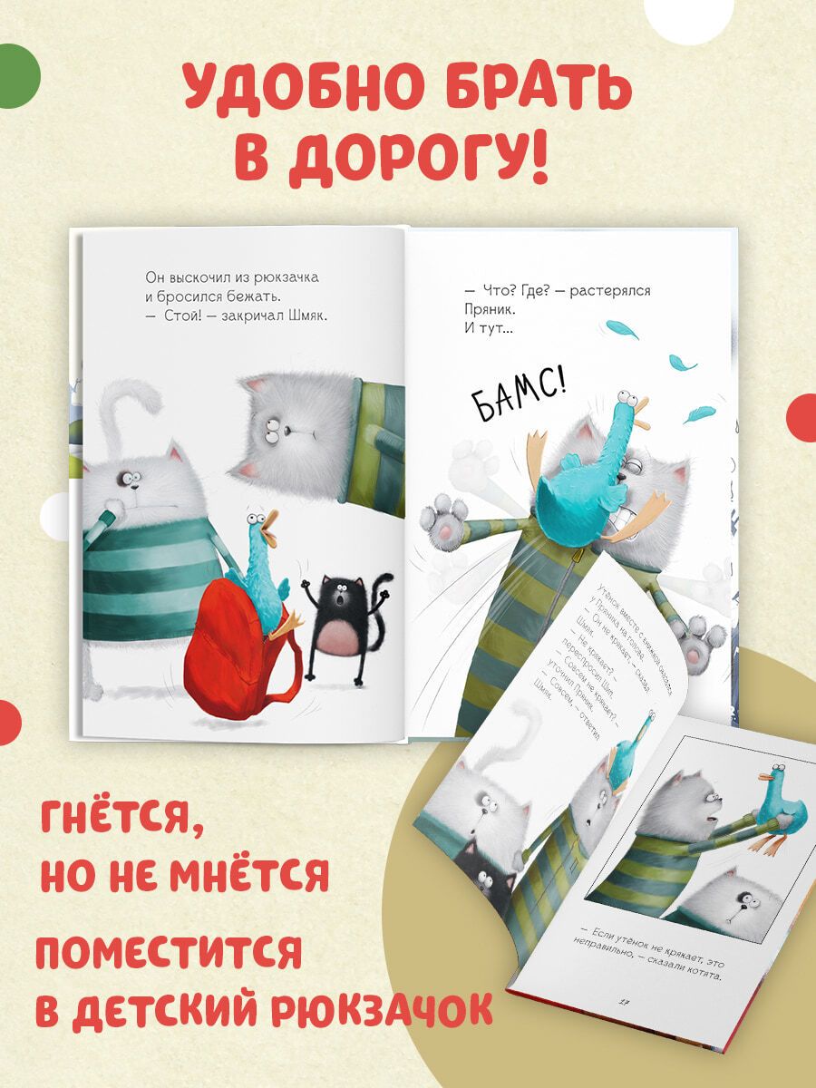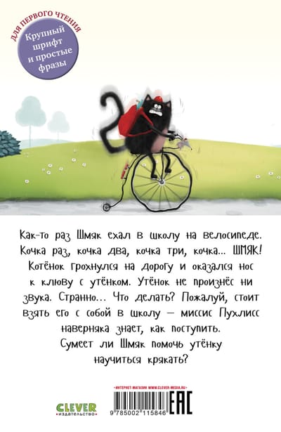 Как‑то раз Шмяк ехал в школу на велосипеде. Кочка раз, кочка два, кочка три, кочка... ШМЯК. Котёнок грохнулся на дорогу и оказался нос к клюву с утёнком. Утёнок не произнёс ни звука. Странно… Что делать? Пожалуй, стоит взять его с собой в школу — миссис Пухлисс наверняка знает, как поступить. Сумеет ли Шмяк помочь утёнку научиться крякать?