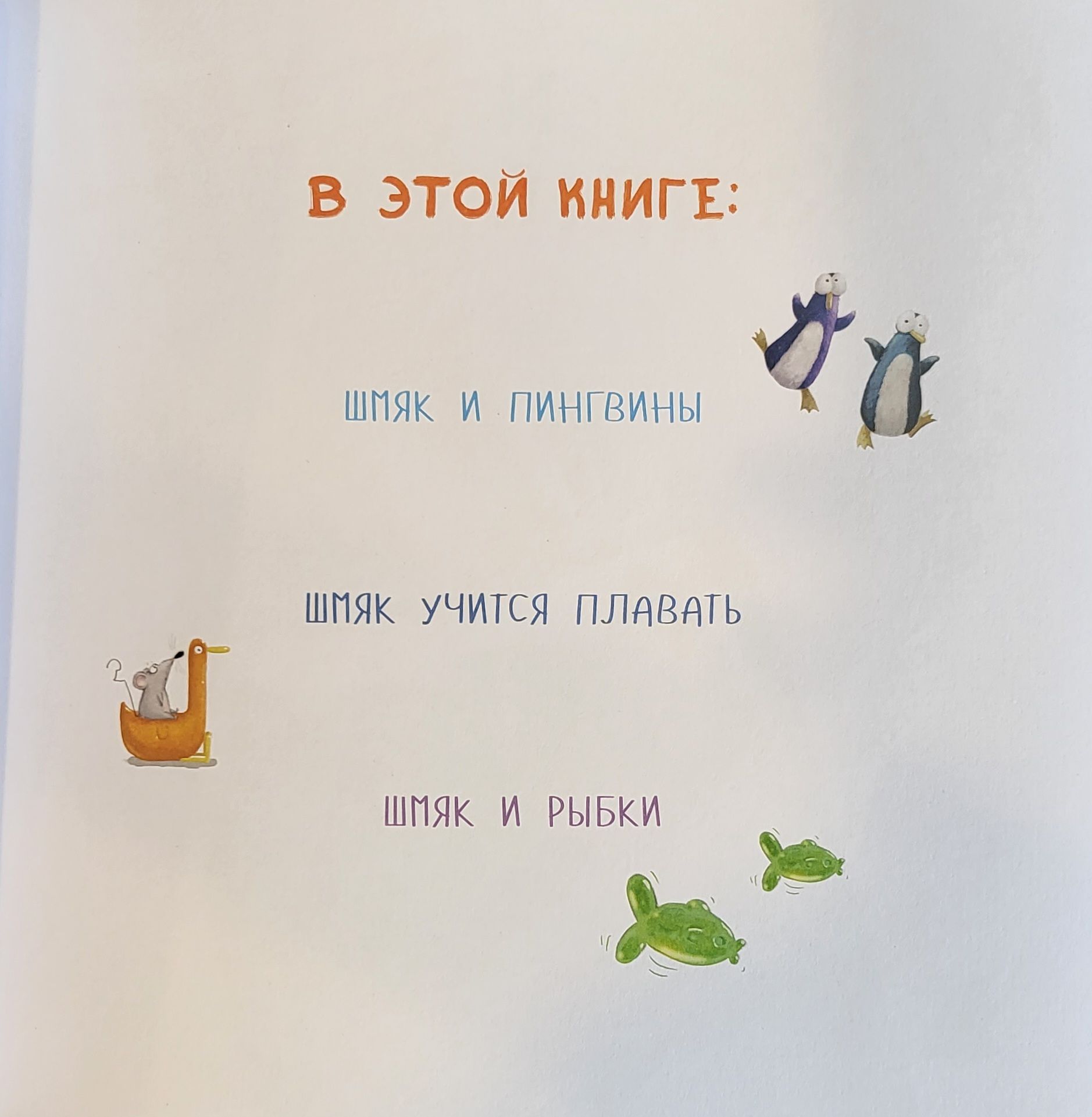 В этом сборнике вы найдёте три захватывающие истории про котёнка Шмяка и его друзей. Вы узнаете, как Шмяк встретил пингвинов, побывал в океанариуме, научился плавать и делать большой плюх.