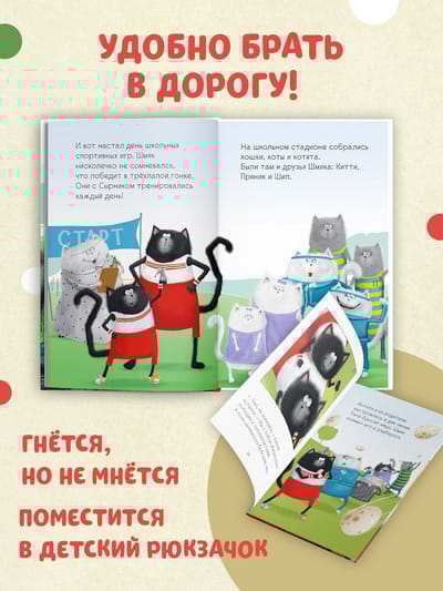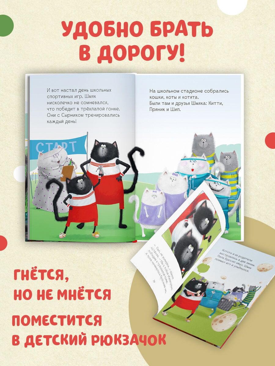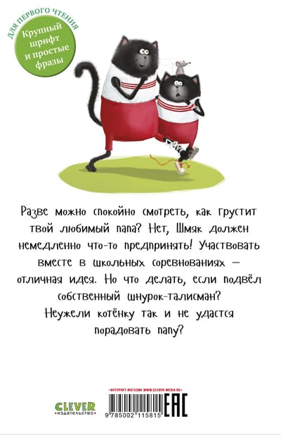 Разве можно спокойно смотреть, как грустит твой любимый папа? Нет, Шмяк должен немедленно что‑то предпринять. Участвовать вместе в школьных соревнованиях — отличная идея. Но что делать, если подвёл собственный шнурок-талисман? Неужели котёнку так и не удастся порадовать папу?