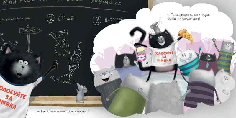 Шмяка выбрали в президенты ученического совета (ну и что, что он был единственным кандидатом). Котенок решил дать громкие обещания всему классу, теперь они будут приезжать в школу на гоночных автомобилях, есть пиццу и мороженое, а домашнюю работу за них сделают роботы. Вот только Шмяк не подумал, чем грозят такие обещания. Кажется, ему придется придумать что-то другое. Как он выкрутится из этой ситуации?