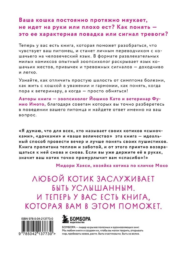 С юмором, простотой и любовью опытный зоопсихолог Йошико Като и ветеринар Фумио Имото расскажут вам о том, что означают кошачьи взгляды, жесты и движения. Как ваш питомец пытается сказать, что любит вас, и когда его поведение может сигнализировать о болезни.